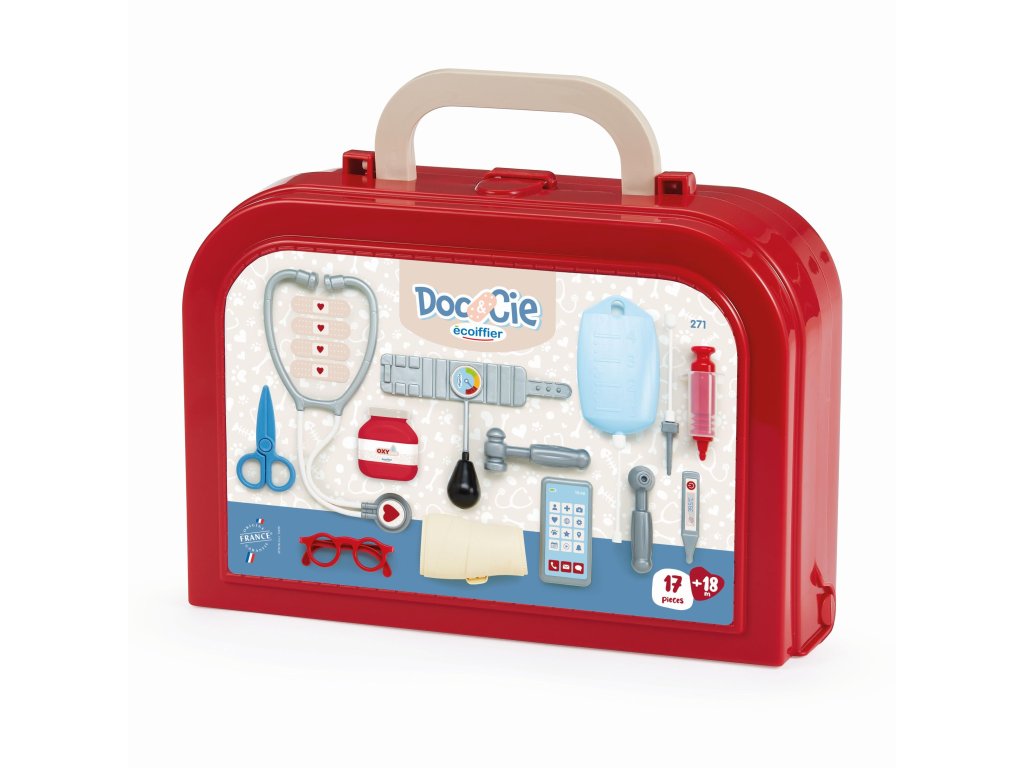 Lékařský kufřík s nezbytným příslušenstvím pro každého lékaře. Obsahuje 17 ks příslušenství - stetoskop, brýle, telefon, tlakoměr, otoskop, reflexní kladívko, lékovou lahvičku, teploměr, infúzní vak, injekční stříkačku, sádrovou ortézu, nůžky a 4 náplasti. Rozměry kufříku: 25,5 x 18 x 10,5 cm.