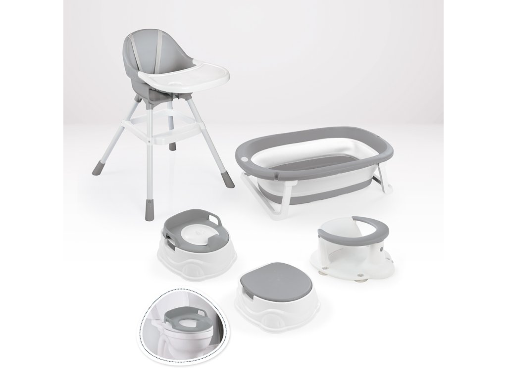 Kompletní výbava pro miminko. S nočníkem 3 v 1 se cítí každý jako král. Vhodný pro začátečníky jako nočník, poté jako adaptér na záchodovou mísu na prkénko a poté jako stupátko. V atraktivní neutrální šedé barvě. Rozměry: 20x34,5x37cm. Věk: 18m+ Dětské sedátko do vany je stabilní díky silným přísavkám. Sedátko přidrží vaše děťátko během koupání. Sedátko je pohodlné a vhodné pro již sedící děti od 6 měsíců. Při koupání nenechávejte dítě v sedátku bez dozoru. Rozměr sedátka: 16,5 x 37,5 x 30,5 cm. Věk: 6m+ Elegantní dětská židlička s pultíkem. Díky bezpečnostnímu pásu je zajištěna bezpečnost dítěte. Snadno omyvatelná a stabilní. Vyrobeno z kvalitního a nezávadného plastu. Věk: 6m+. Rozměr: 90 x 70 x 40 cm. Skládací dětská vanička je pohodlným řešením pro každého rodiče a batole. Ideálně se hodí do domácnosti i na výlet nebo víkendovou návštěvu rodiny. Po použití stačí vypustit vodu zabudovaným ventilem. Ve složeném stavu zabírá velmi málo místa. Rozměry: 20,5x75,5x45,2cm. Věk: 6m+ Nosnost: 15kg.