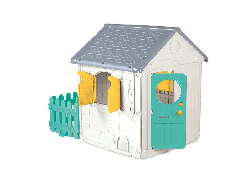 Vstupte do kouzelného zahradního domečku s plotem My First House. Krásný domeček v bílé barvě doplněný žlutými okenicemi a zadními dveřmi, zeleným plotem a vchodovými dveřmi. Šedá střecha má efekt skutečných střešních tašek. Zabavte děti v letních dnech na zahradě nebo za deštivého počasí umístěte domeček dovnitř do herny. Dětský domeček na hraní je bezedný, má vchodové dveře s poštovní schránkou, dvě okna s okenicemi, zadní dveře do oplocené zahrádky, dvířka pro kočky a elektronický zvonek. Děti budou moci objevovat všechny zábavné funkce, až pozvou svoje kamarády na návštěvu. Tento zahradní domeček podporuje dětskou představivost, manuální zručnost a fyzický rozvoj. Vhodné pro použití venku i uvnitř. Vyrobeno z odolného plastu. Potřebné baterie: 3 x 1,5V LR44 AG13 (jsou součástí). Rozměry domečku: 122,5 x 104 x 156 cm. Rozměry balení: 122,5 x 156 x 104 cm. Věk: 2 +