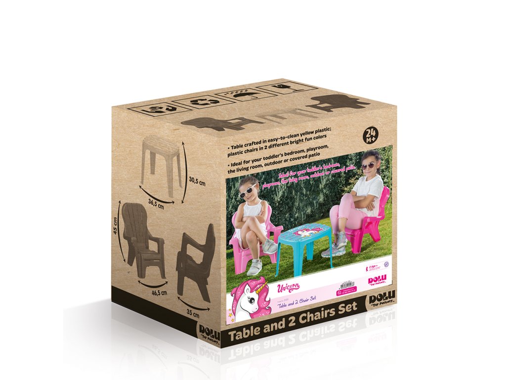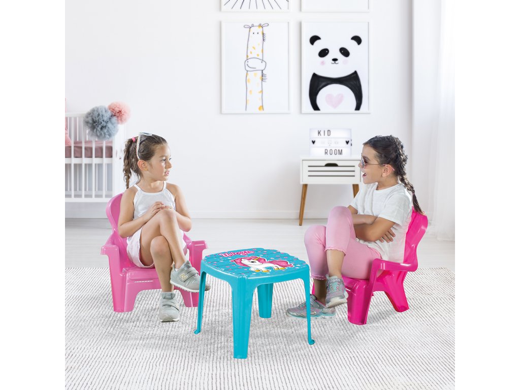Dětský stoleček s motivem jednorožce a dvěmi židličkami je vhodný pro vnitřní i venkovní použití. Růžovo-fialové provedení. Děti mohou stoleček používat pro své hry, při kreslení a různých výtvarných činnostech. Vyrobeno z kvalitního a odolného materiálu. Věk: 24m+. Rozměr: 45x35x45 cm. Váha: 2,8 kg.