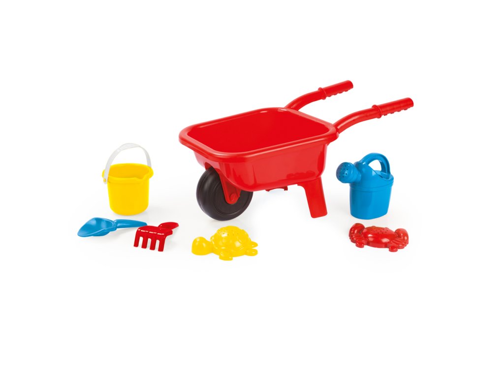 Pro malé zahradníky se bude hodit krásné červené kolečko, aby vám mohli na zahradě pomáhat. Zároveň se sadou na pískoviště - kyblíček, konvička, lopatka, hrabičky a 2 bábovičky. Rozměry: 61x51x25cm Věk: 3+
