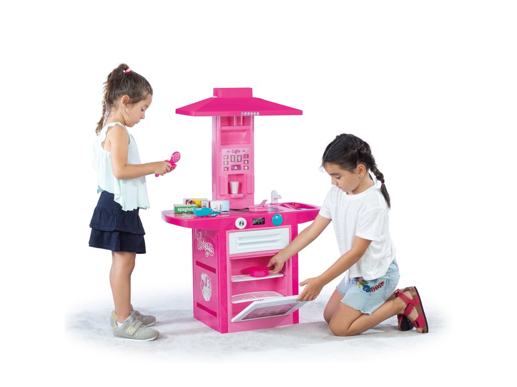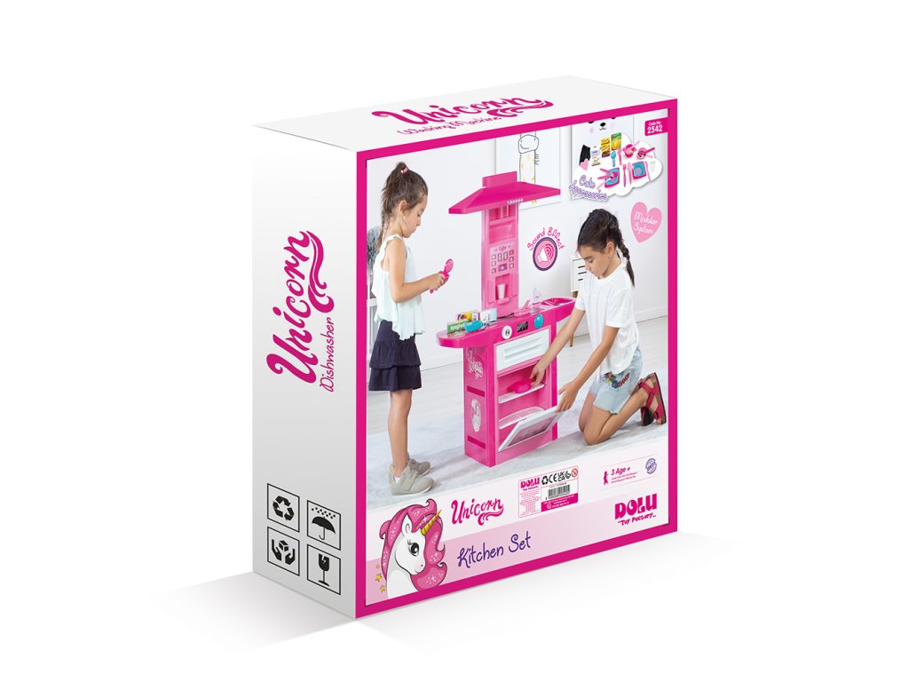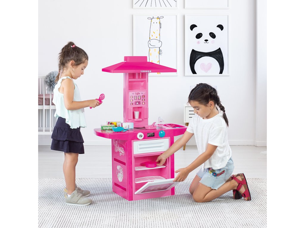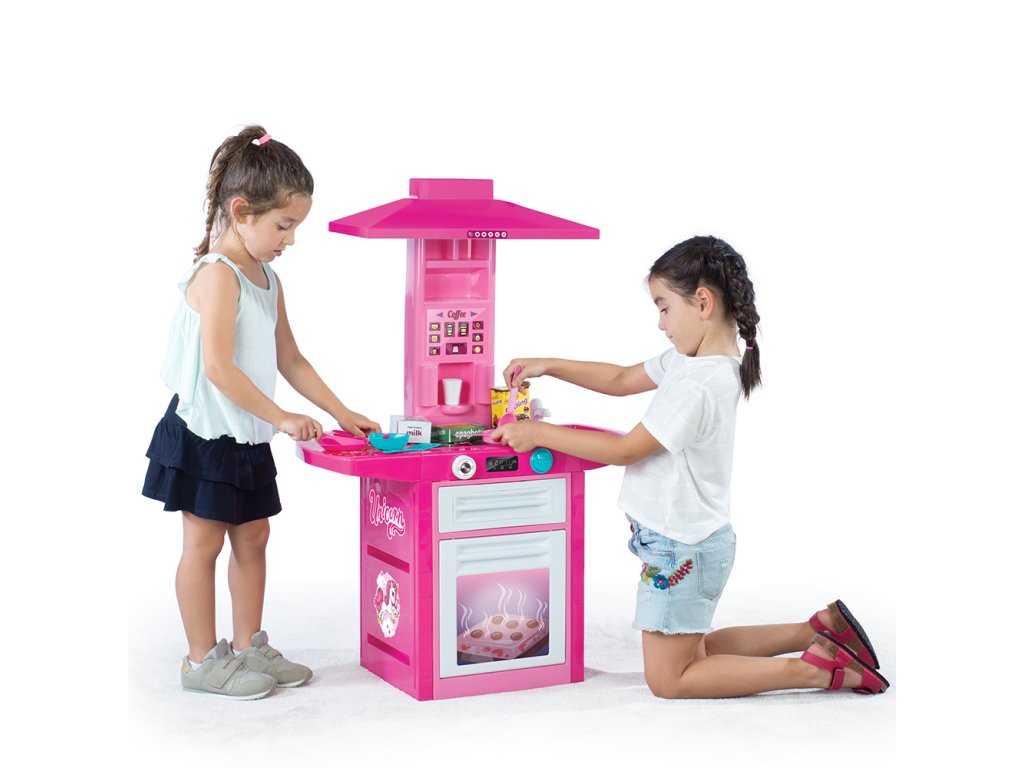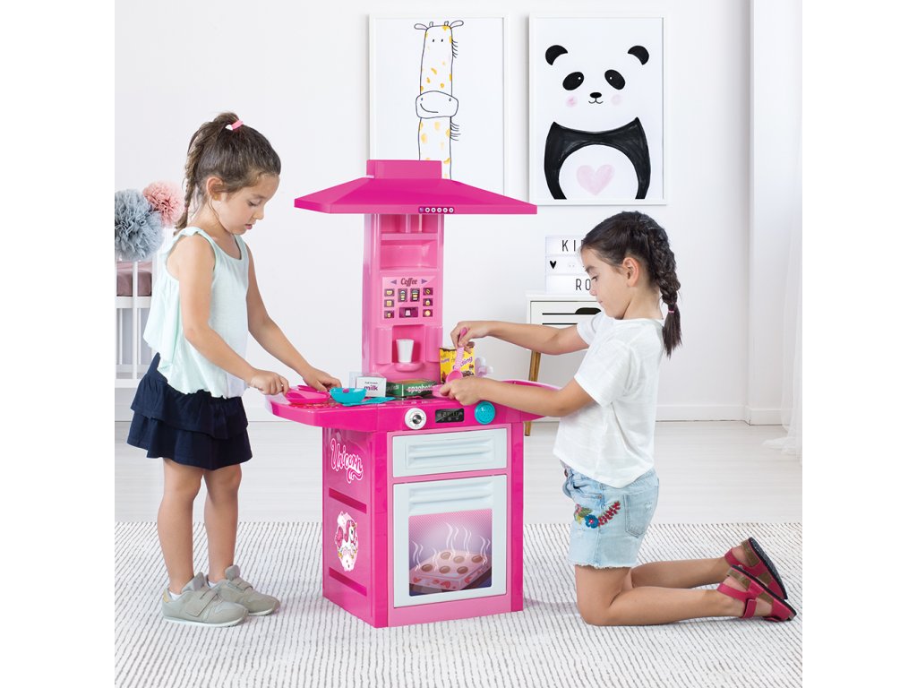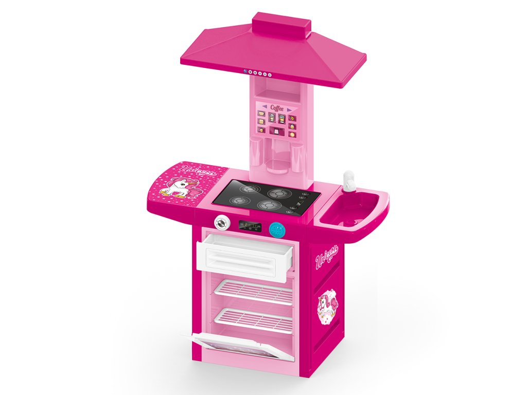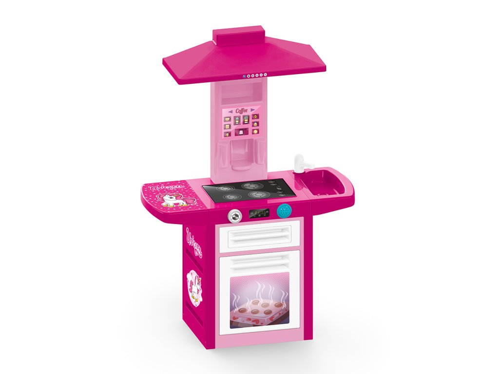 Dětská plastová kuchyňka pro malé kuchařky! Růžovo-bílé provedení s jednorožcem. Součástí kuchyňky je trouba na pečení, sporák na vaření, digestoř, automat na kávu, dřez na mytí nádobí a odkládací prostor na umyté nádobí. Kuchyňka vydává zvuk. Vyrobeno z kvalitního a odolného materiálu. Věk: 36m+. Rozměr: 100 x 71,5 x 30,5 cm.