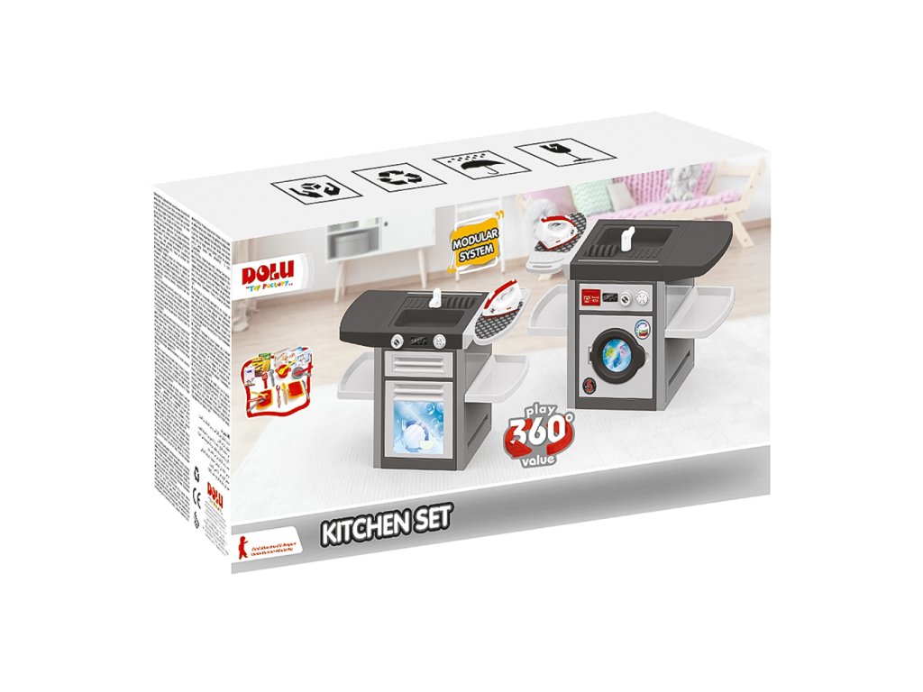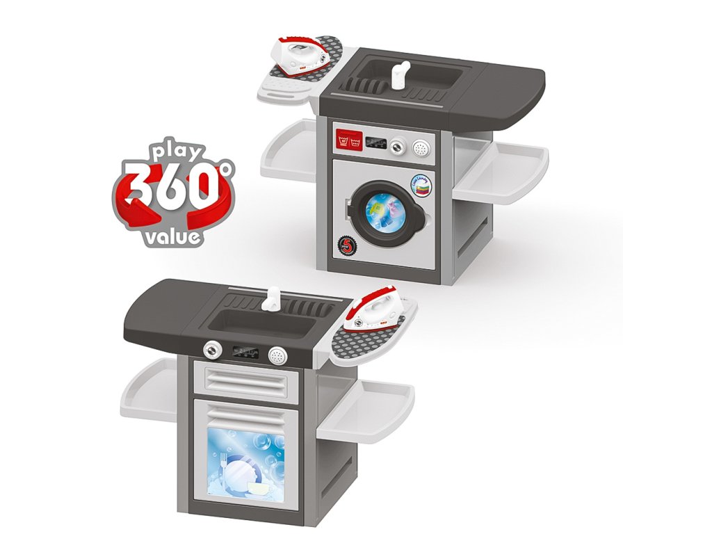 Oboustranná kuchyňka potěší všechny malé kuchaře a kuchařky. Barevné provedení je vhodné pro kluky i holčičky. Z jedné strany myčka na nádobí, dřez včetně baterie a odkládací prostor na umyté nádobí. Ze strany druhé je umístěna pračka, žehlící prkno, žehlička a odkládací prostor na vyžehlené prádlo. Produkt obsahuje nádobí, příbory a čistící prostředky. Vyrobeno z kvalitního a odolného materiálu. Věk: 36m+. Rozměr: 58 x 71,5 x 39 cm.