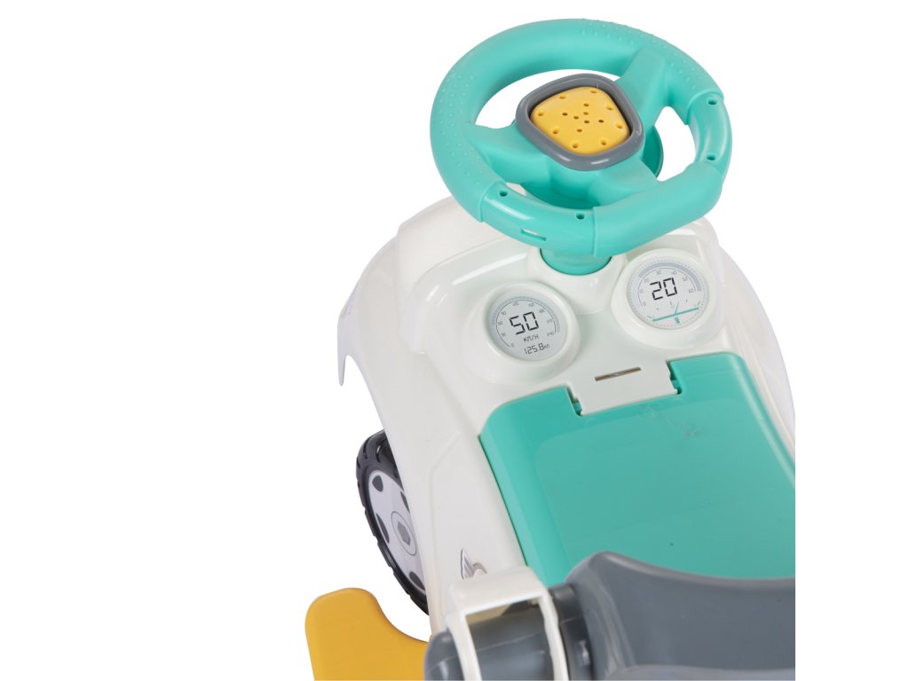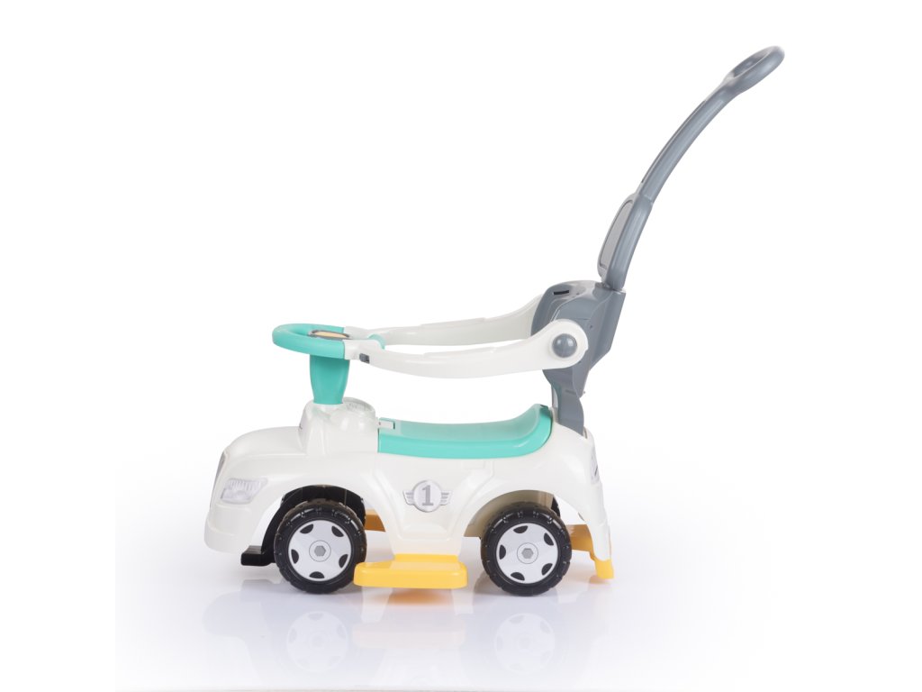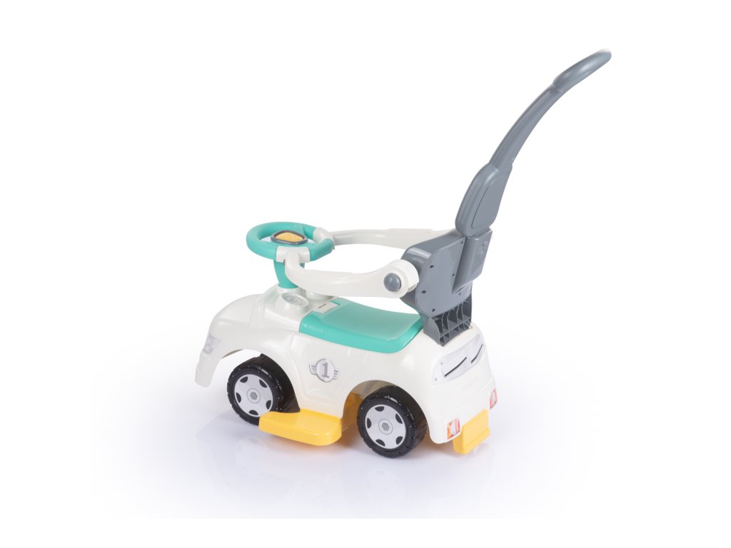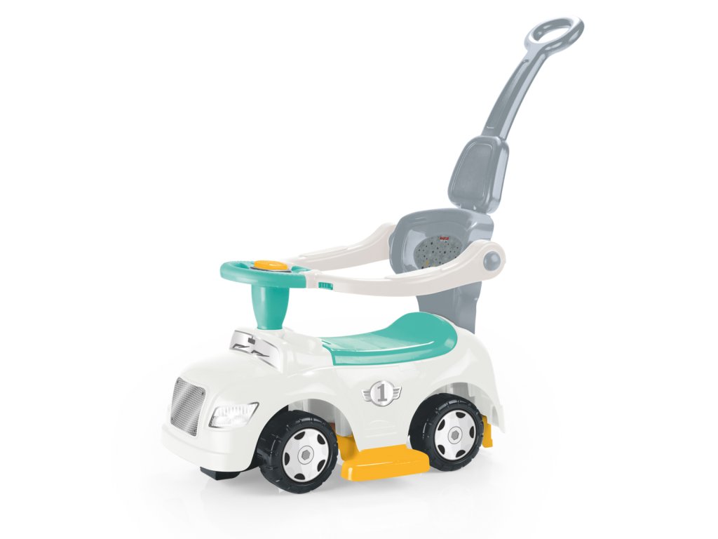 Bílé autíčko s barevnými doplňky. Využití jako vozítko, chodítko i odrážedlo. Součástí je vodící rukojeť, kterou je možné odejmout. Boční bezpečnostní chrániče, které lze odejmout. Spodní stupátka na nožičky, které lze odejmout. Úložný prostor je umístěn pod sedadlem. Vyrobeno z kvalitního a stabilního plastu. Volant s klaksonem. Rozměr výrobku: 85 x 41 x 87 cm. Balení: 63x37x31cm. Věk: 12m+