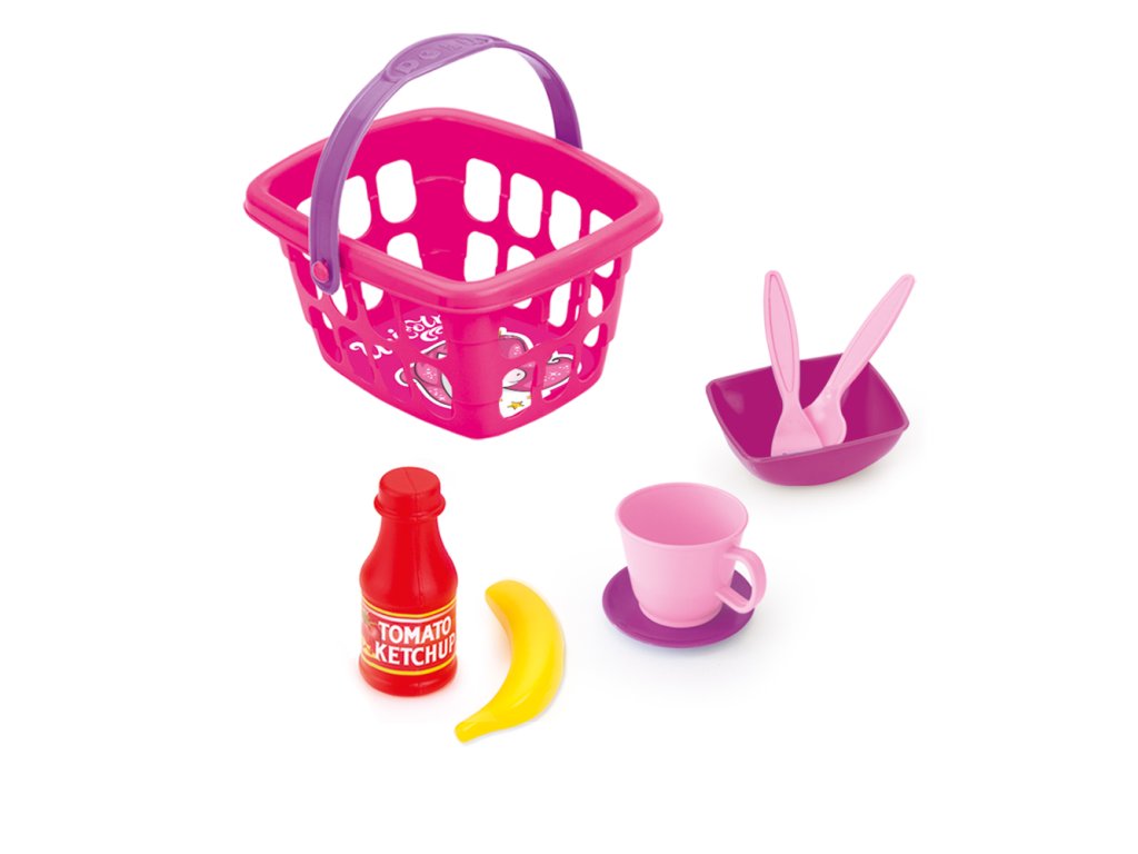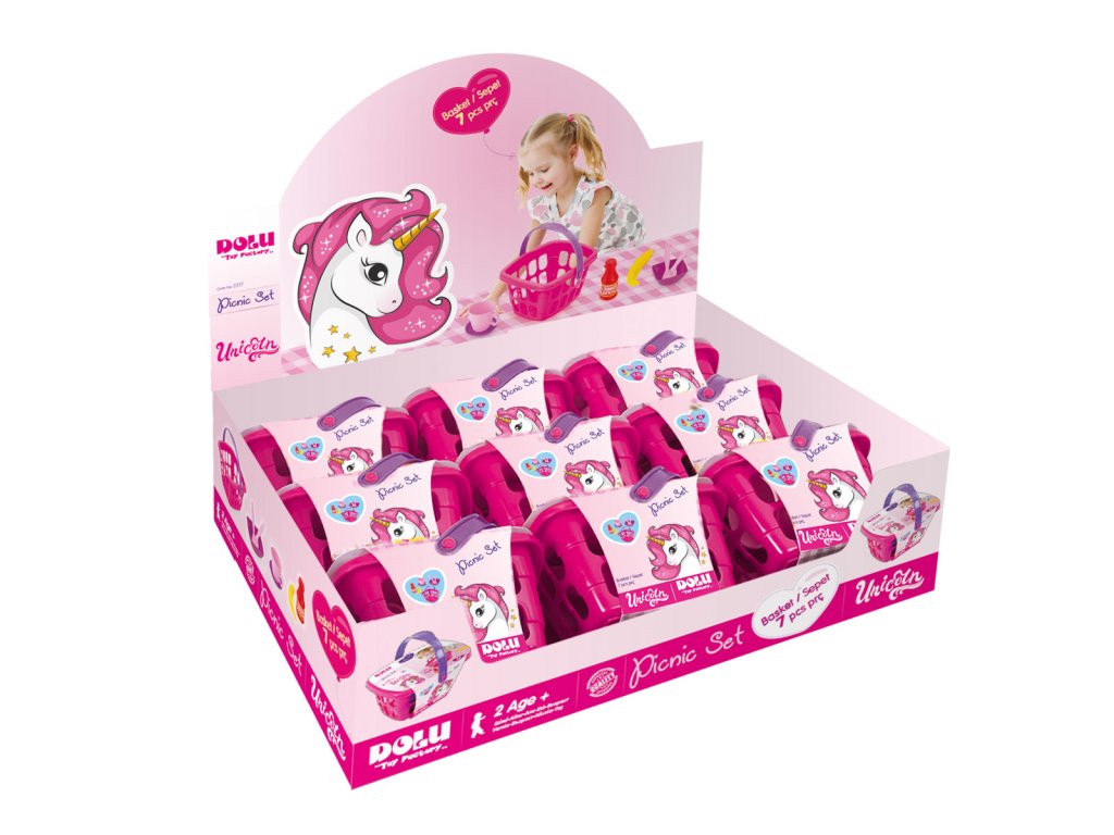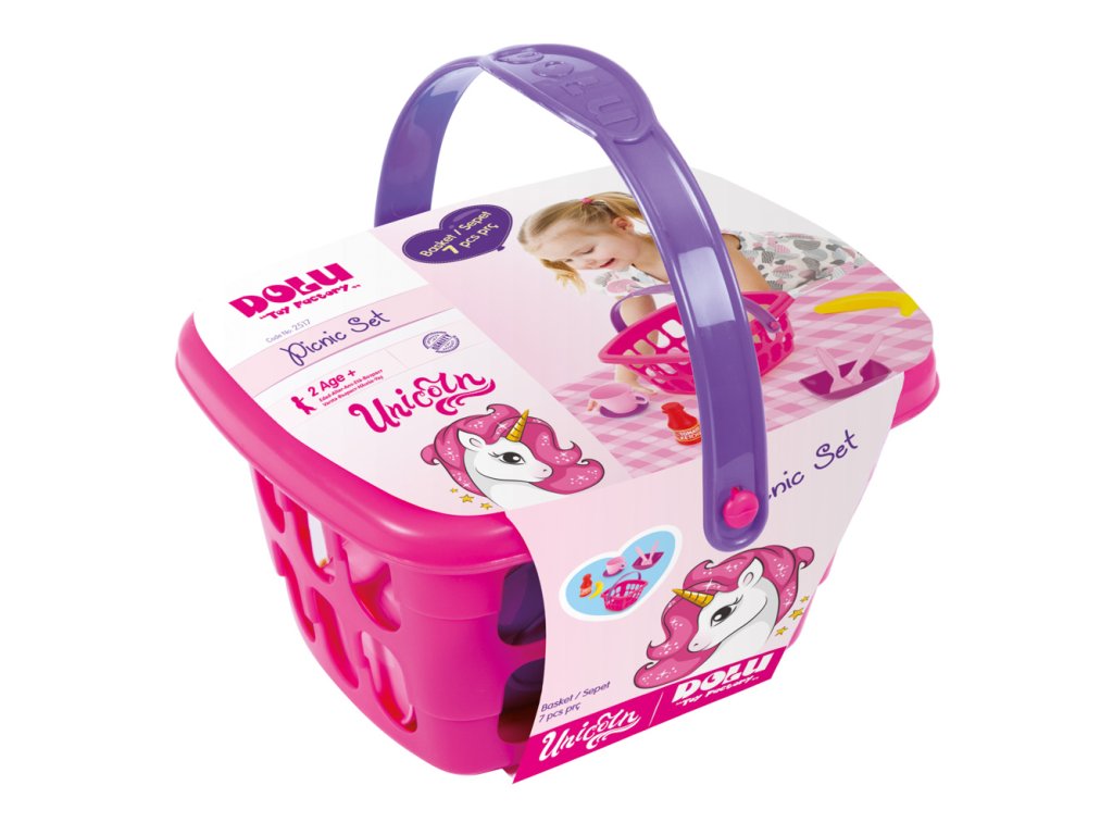 Piknikový košík s motivem jednorožce. Sada obsahuje: košík, miska s příborem, hrnek, talířek, lahev kečupu a banán. Rozměr výrobku: 12 (s postaveným uchem 14cm) x 14,5 x 13 cm. Věk: 24m+