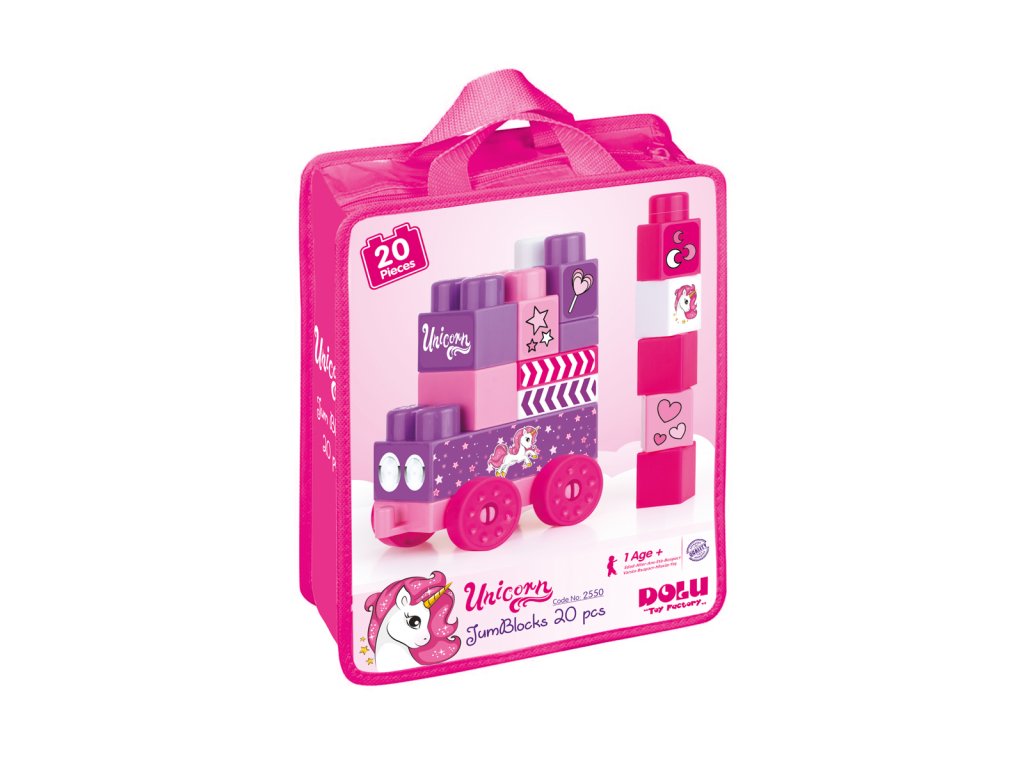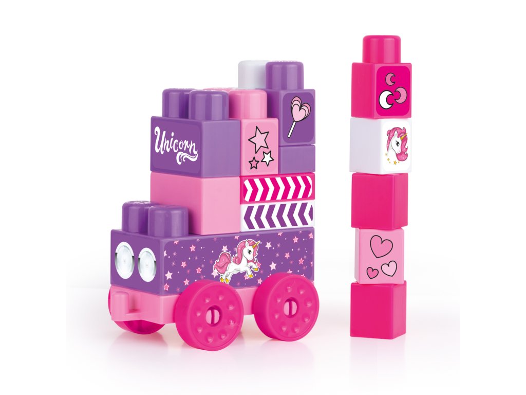 Zábavná stavebnice s designem jednorožce, která se skládá z 20 kusů. Sada je uložena v tašce na zip s rukojetí. Obsahuje velké kostky, některé mají potisk obrázků. Produkt povzbuzuje malé děti k rozvoji kognitivních dovedností a manuální zručnosti. Rozměr balení: 20,1x25,2x9,3 cm. Věk 12m+