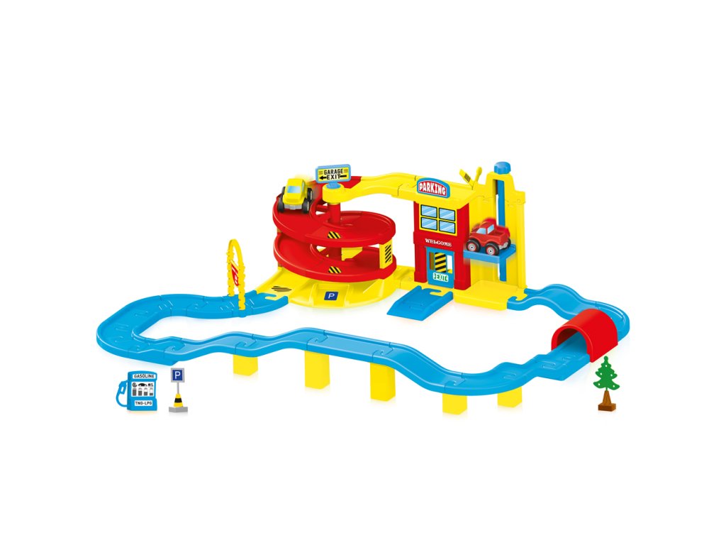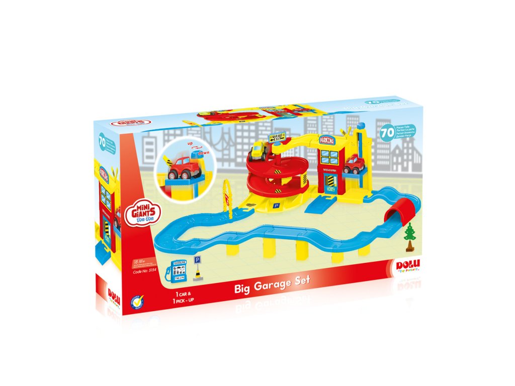 Velká garáž je snem každého malého řidiče! Vyrobeno z kvalitního a odolného materiálu. Barevné provedení - modrá, zelená, žlutá a oranžová barva. Balení obsahuje: 1x autíčko, 1x pick-up, dopravní značka, strom, pumpa a silnice (celkem 70 dílků) Hračka má funkční výtah a dveře. Věková kategorie: 18m+ Velikost výrobku: 108,5 x 77,5 x 30 cm