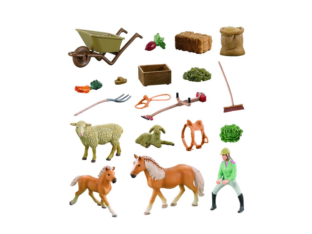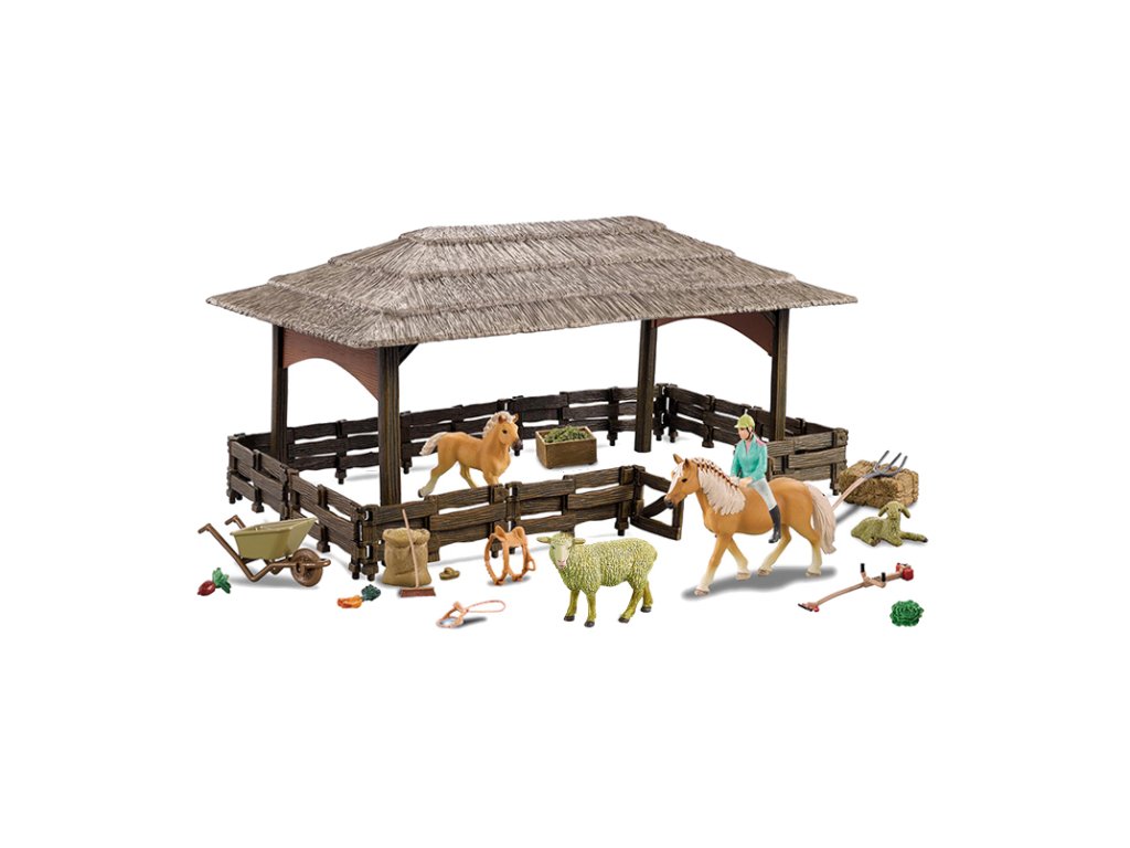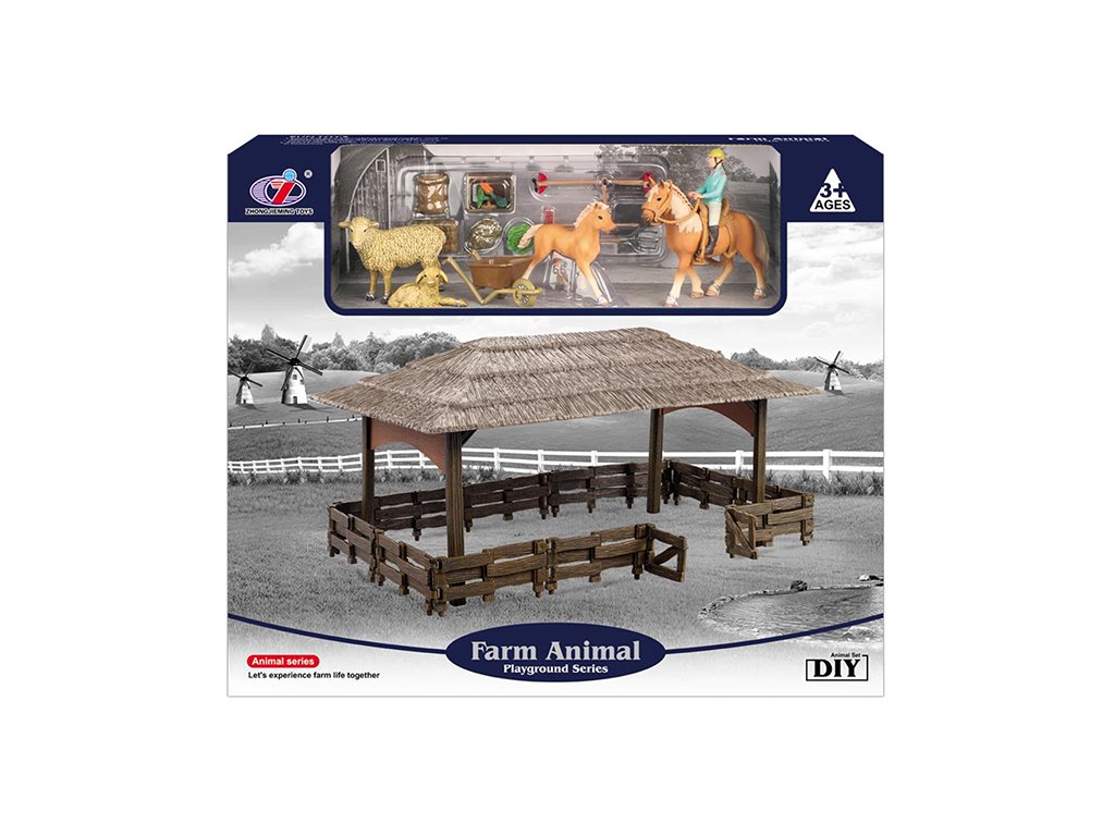Exkluzivní farmářská sada s elegantním přístřeškem. Sada obsahuje jednoho koně, jedno hříbě, jednu jezdkyni, jednu ovci, jedno jehně a spoustu příslušenství, bez kterého se pravý farmář neobejde. Tato hračka je součástí kolekce Moje malá farma.