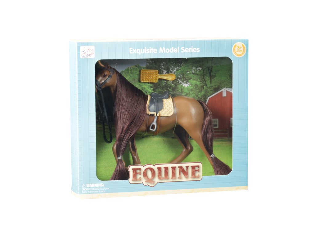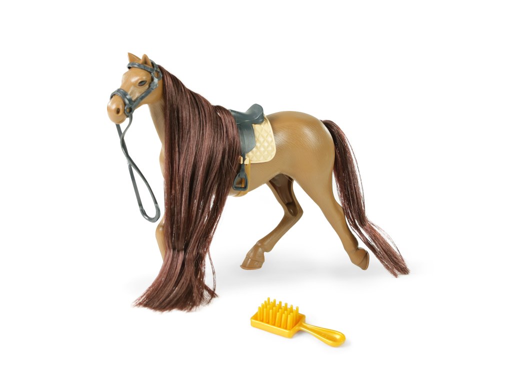 Hnědý kůň s krásnou česací hřívou a sedlem. Koníčka můžeš česat hřebenem, který najdeš v balení. Kůň je vyroben z plastu a jeho velikost je 20 cm.