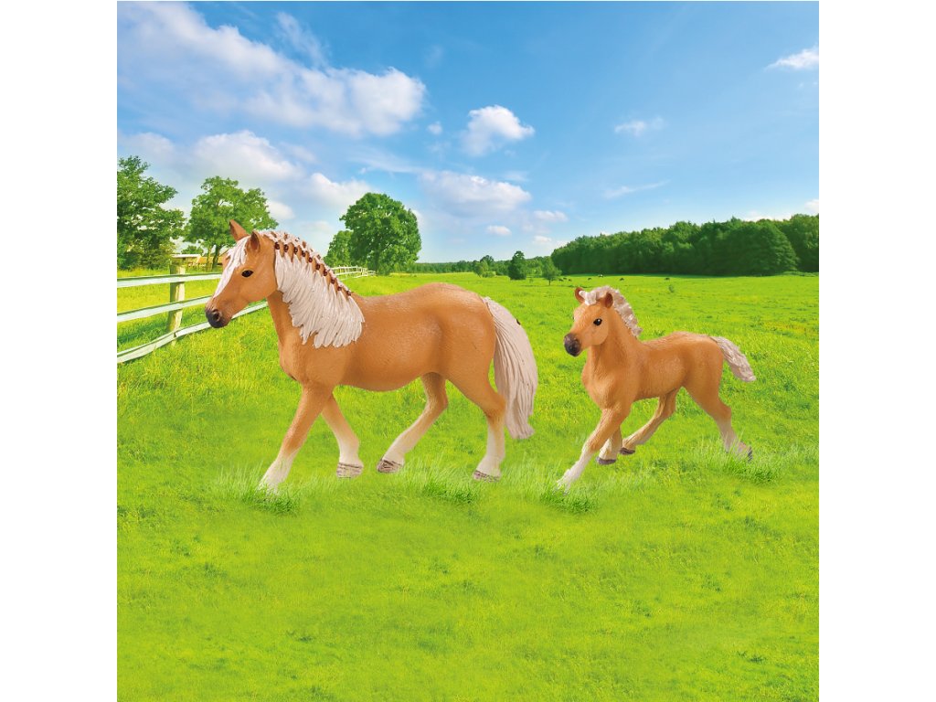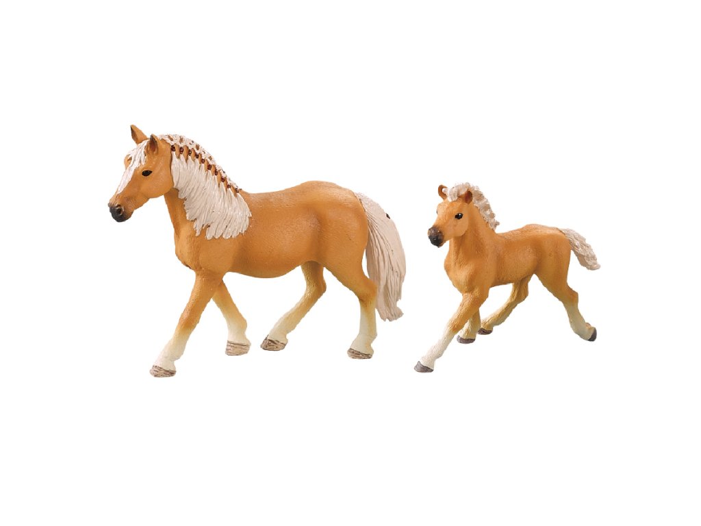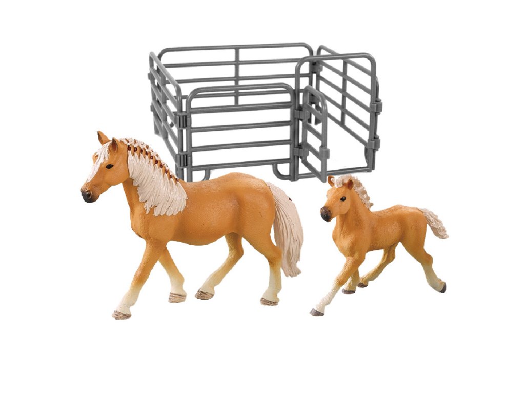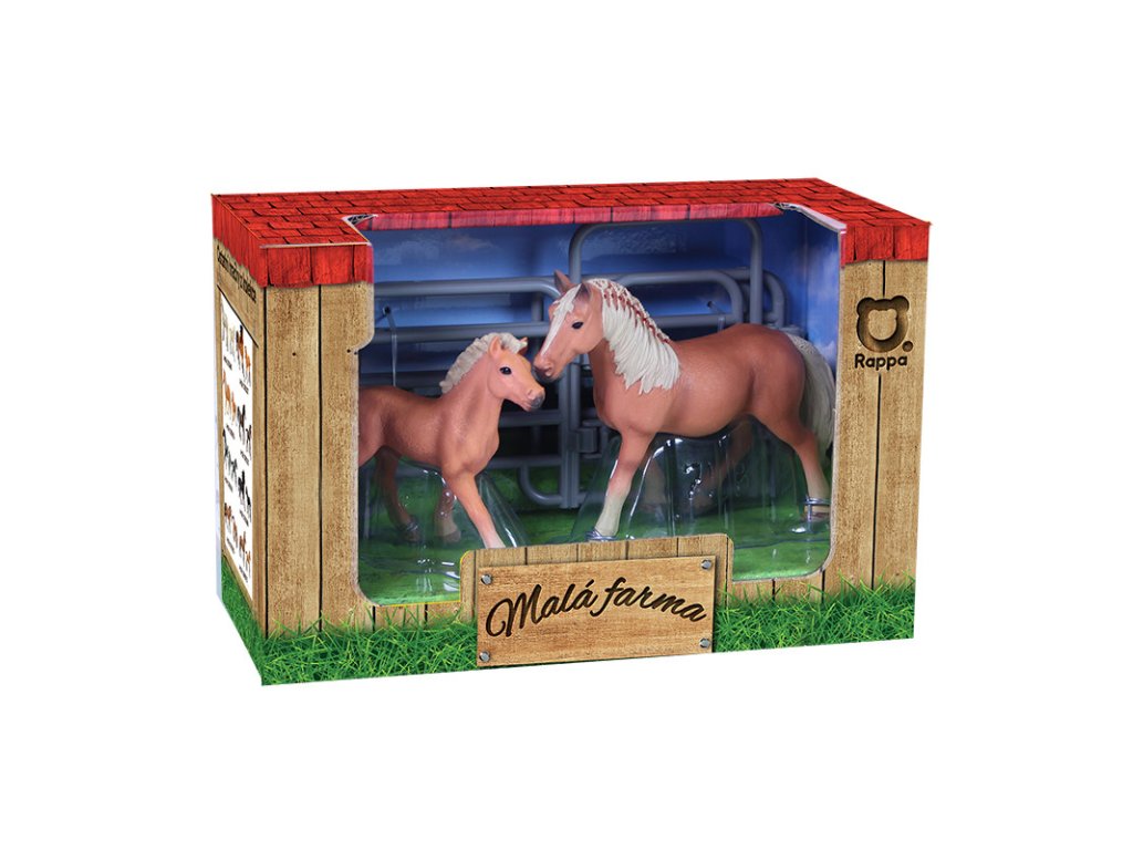 Figurka koně a hříběte v hnědé barvě se světlou hřívou. Součástí balení také ohrada. Ideální pro milovníky koní. Tato hračka je součástí kolekce Moje malá farma.