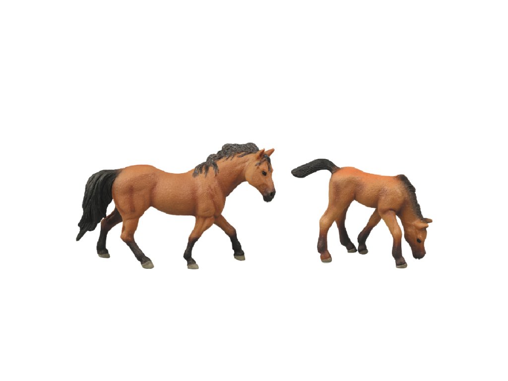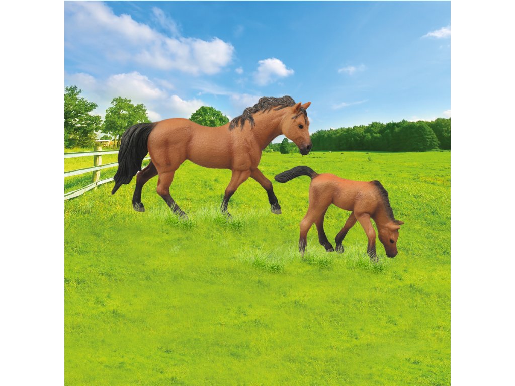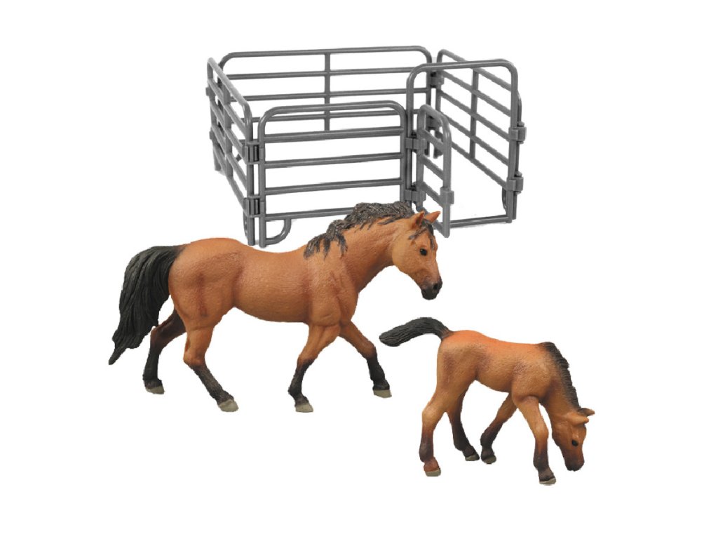 Figurka koně a hříběte v hnědé barvě. Součástí balení také ohrada. Ideální pro milovníky koní. Tato hračka je součástí kolekce Moje malá farma.
