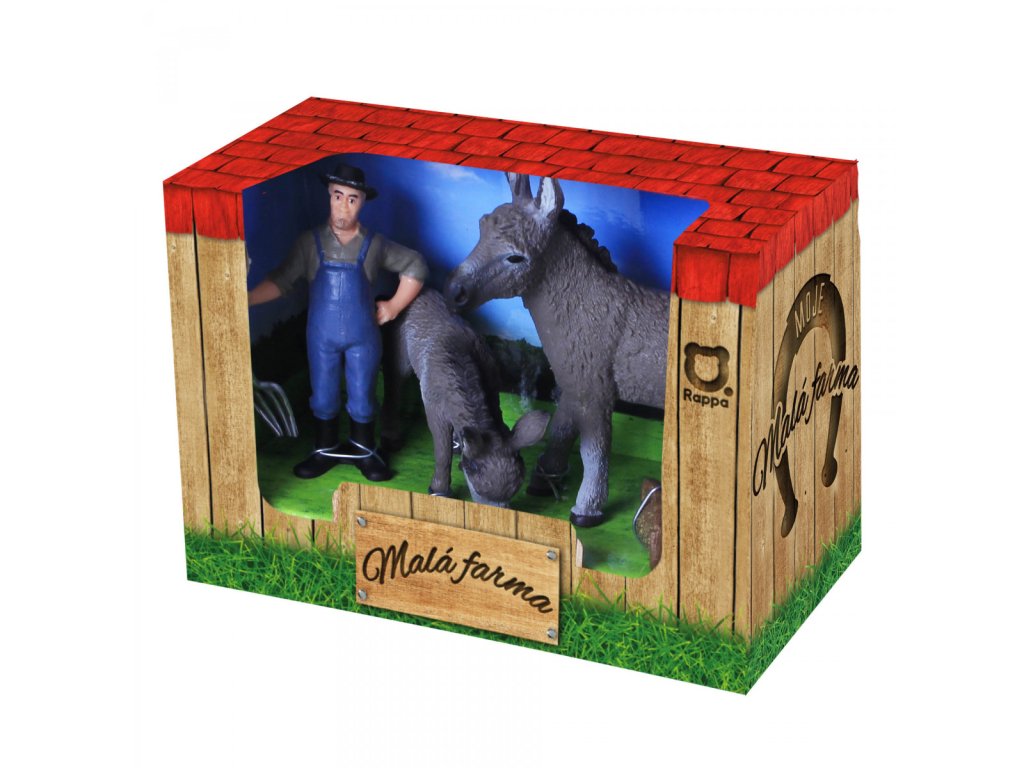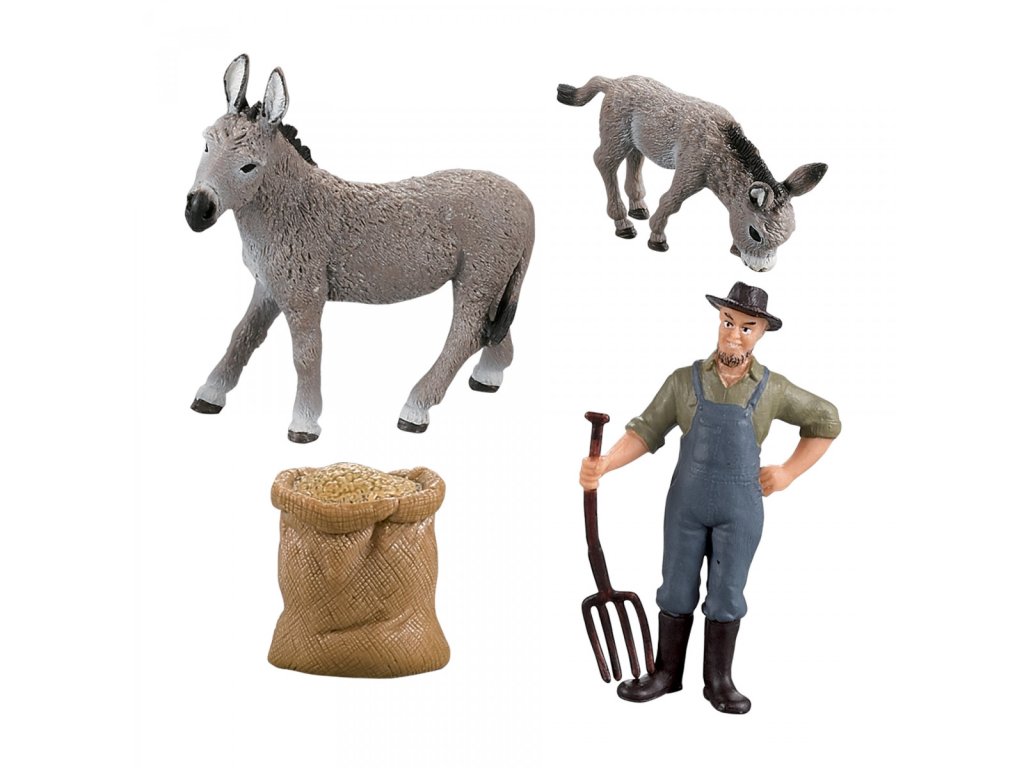 Farmářská zvířátka, která vypadají jako živá! Sada obsahuje 2 osli a figurku farmáře, vše je vyrobeno z kvalitní, tvrdé gumy. Hračka je součástí kolekce Moje malá farma.