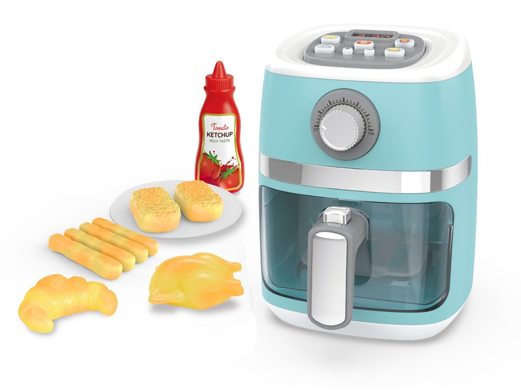 Fritéza s efekty. Rozměry 15x17x20cm. Potraviny součástí balení. Po vložení do fritézy a zapnutí potraviny mění barvu. Světelné a zvukové efekty. 3xAA baterie nejsou součástí.