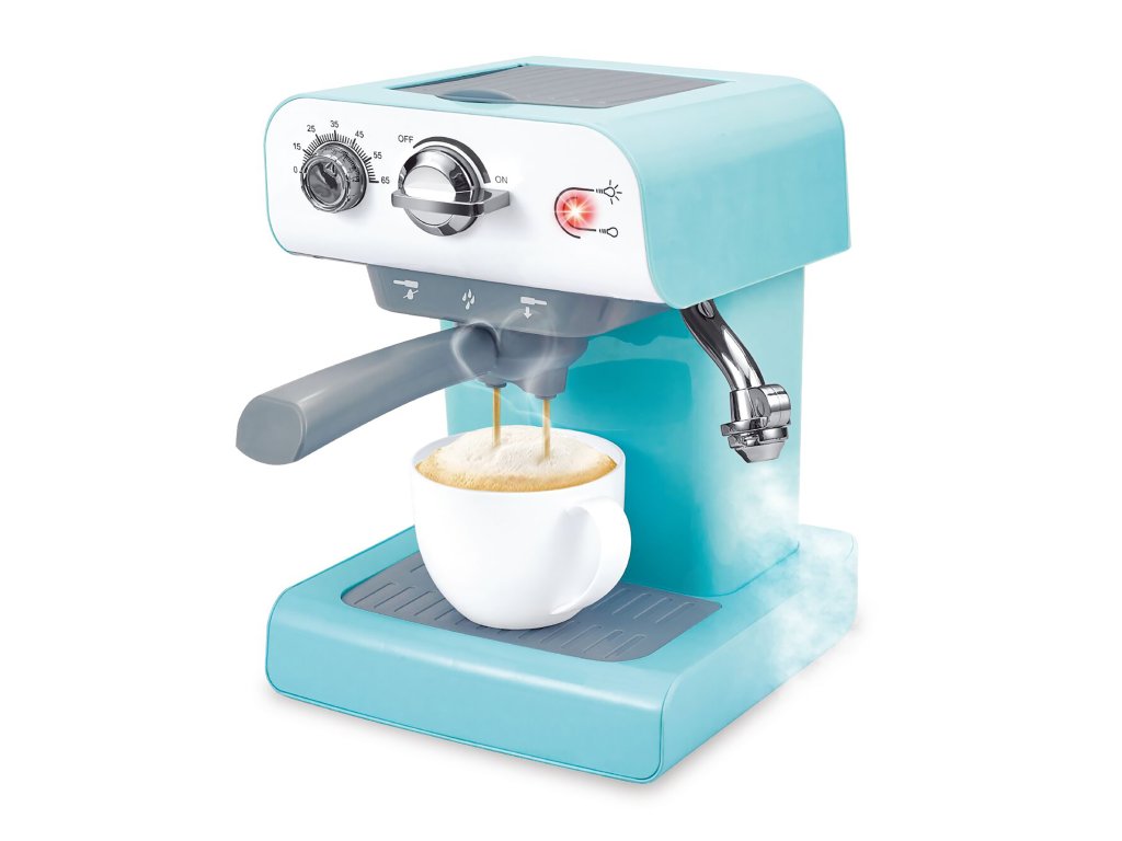 Kávovar pákový s efekty a párou. Rozměry 22x21x26.5cm. 3xAA baterie nejsou součástí. nádržka na vodu je na horní straně kávovaru. Když páka směřuje doprava, dá se odejmout nebo přidělat. Pro zafixování dejte páku směrem dopředu. Světelné a zvukové efekty. Když se kávovar zapne a rozsvítí se kontrolka, vychází z trysky pára.