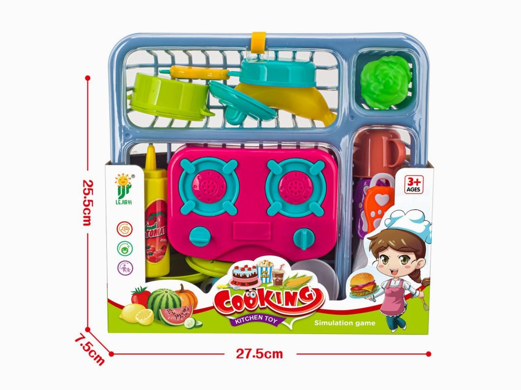 Kuchyňský set. Rozměry 27,5x25,5x7,5 cm. Součástí odkapávač, nádobí, sporák, zelenina (ovoce).
