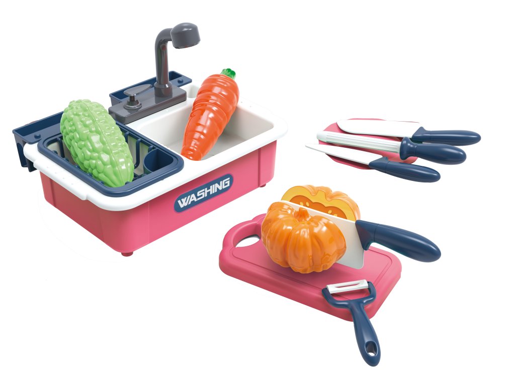 Kuchyňský set. Rozměry dřezu 19x13,5x6 cm. Dřez, odkapávač, 3 nože, brousítko nožů, krájecí prkénko, škrabka, rozkrojitelná mrkev, kukuřice, dýně.