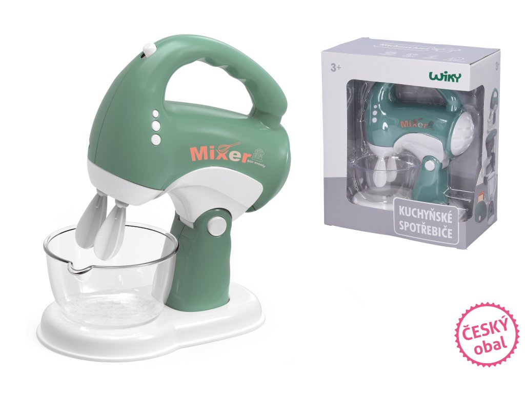 Mixér s efekty. Velikost 16x6x12 cm. Baterie 2xAA, nejsou součástí. Vydává světelné a zvukové efekty. Baterie jsou umístěny zespod mixéru, který je nejdříve potřeba odcvaknout od podstavce.