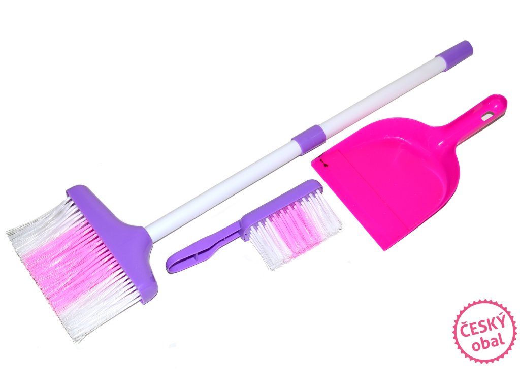 Plastová dětská sada na úklid. Obsahuje lopatku, smetáček a smeták. Vyrobeno z růžovo-bílého plastu.