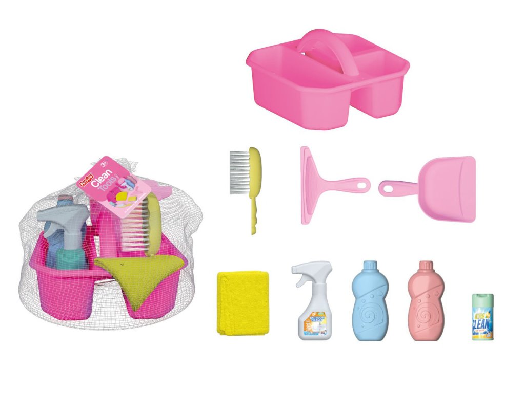 Úklidový set 9ks. Obsahuje vaničku na přenášení, lopatku a smetáček, stěrku, hadřík, čisticí prostředky.