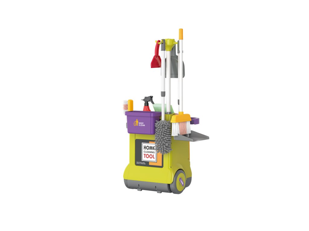 Úklidový set s vozíkem. Rozměry 33,5x31,5x71 cm. Vozík, lopatka velká, lopatka malá, smeták velký, smeták malý, smetáček, prachovka, stěrka na okna, mýdlo, 2 čistící prostředky ve spreji, podložka, pouzdro. varovná cedule. Obrázkový návod na složení na obalu.
