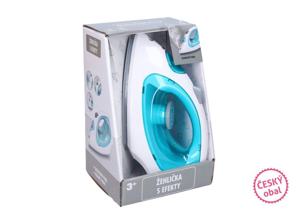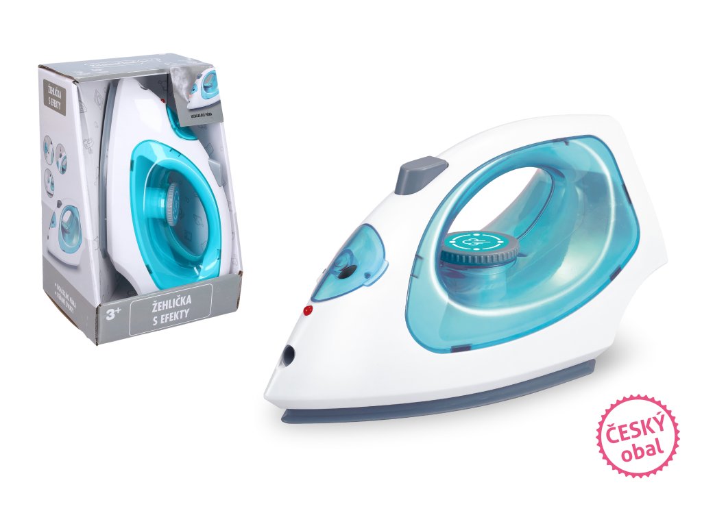 Žehlička s efekty. Velikost 22 cm. Světelné a zvukové efekty. 3xAA baterie nejsou součástí. Lze naplnit vodou, upouští páru po stlačení tlačítka.