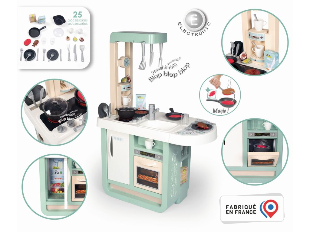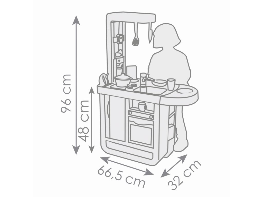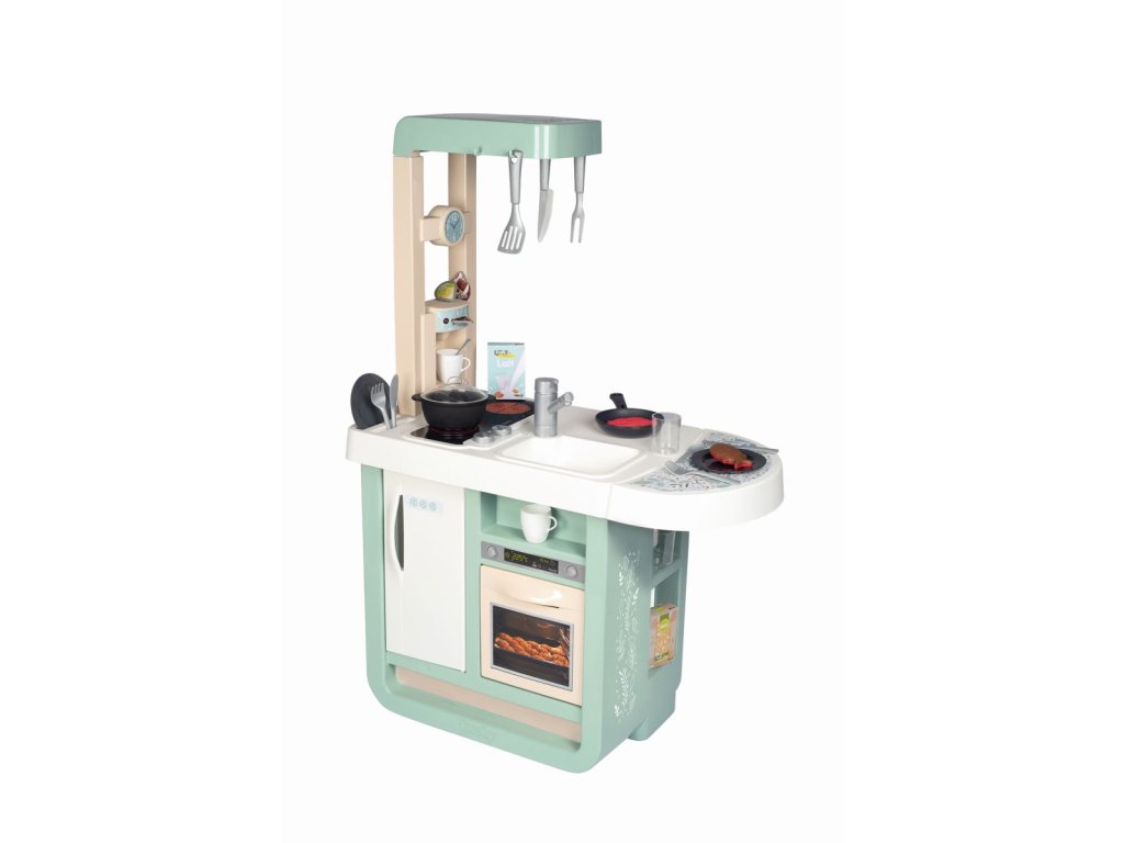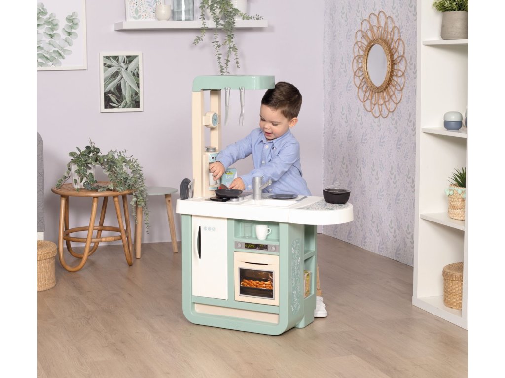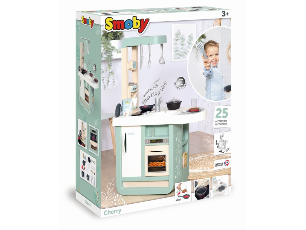 Kuchyňka Cherry v moderním designu se spoustou kuchyňských doplňků obsahuje 25 příslušenství. Kompaktní a realistická dětská kuchyňka, která je celá navržena v moderním designu současných kuchyní. Díky krásnému zbarvení v jemných pastelových tónech se hodí do dětského pokoje i do společného obývacího pokoje. Kuchyně Cherry má sporák se dvěma plotýnkami, troubu a digestoř. Elektronický zvukový modul v jedné z plotýnek zajišťuje realistické zvuky vaření. Kuchyňka na hraní má také lednici, dřez s kohoutkem a espresso kávovar s různými kapslemi na čaj a kávu. Maso a ryby mají dvě různé strany, syrové a smažené. Rozsáhlé příslušenství lze snadno uložit do jedné z mnoha polic. Hrací plocha je rozšířena o malý stolek. Součástí vybavení je rendlík s poklicí, talíř, příbory, nádobí, makety obalů od jídla, hrnek, hrneček a pánev. Výška pracovní plochy: 48,5 cm. Rozměry produktu (DxŠxV): 66,5 x 32 x 95,7 cm.