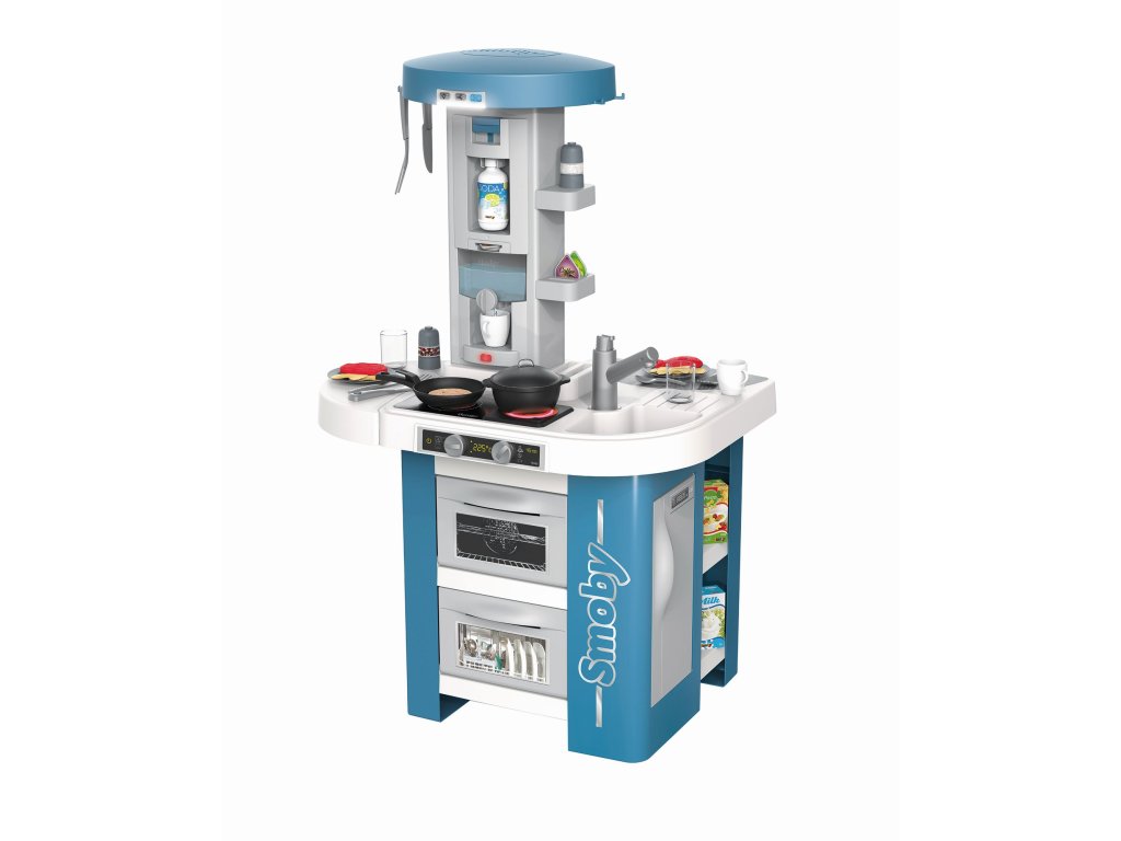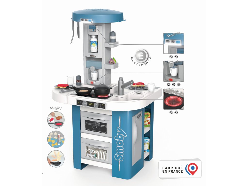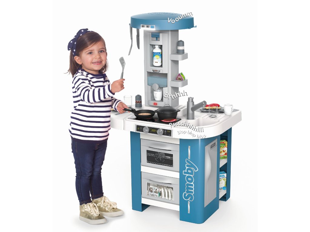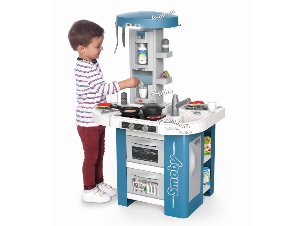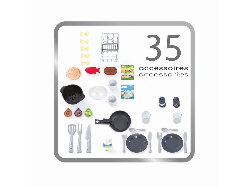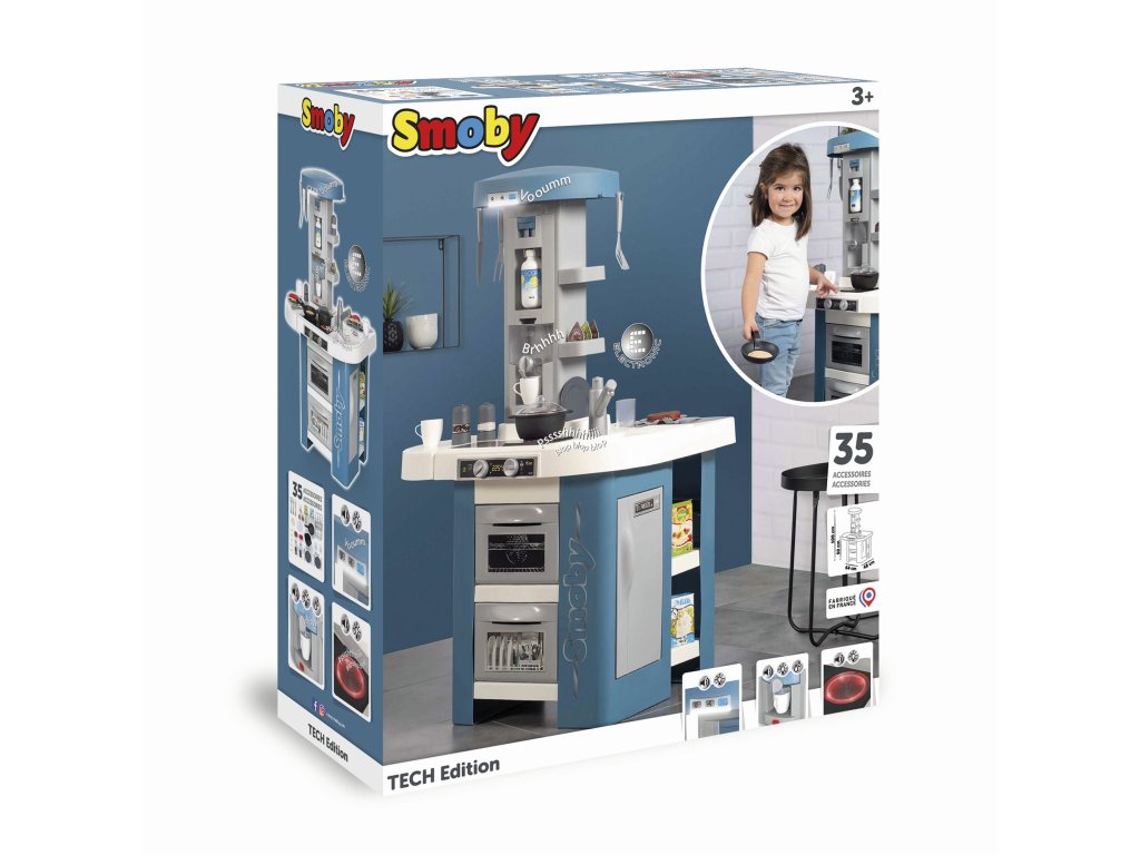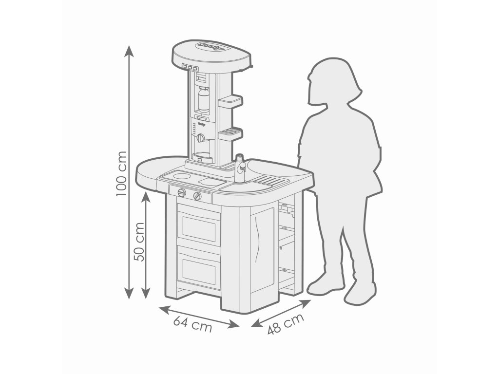 Stabilní kuchyňka Studio Tech Edition je kompaktní, stabilní kuchyňka s mnoha extra elektronickými funkcemi. S velkou herní plochou 360° - lze si hrát ze všech stran. Kuchyňská deska je vybavena elektronickou varnou deskou se dvěma různými zvuky vaření a červeným osvětlením. Kávovar má plnitelnou nádržku na vodu, pomocí které lze přes ventil plnit vodu do šálků. Po stisknutí tlačítka se objeví blikající světlo, které napodobuje zahřívání přístroje, a když tlačítko znovu stisknete, uslyšíte realistický zvuk přístroje na espresso. Digestoř má tři různé úrovně hluku a také světelnou funkci. Kuchyňka má také troubu, myčku, lednici, dřez s kohoutkem, automat na sodu a několik úložných prostor. Obsahuje 35 zábavných doplňků: těstoviny, které ve studené vodě mění barvu, pánvičku na snadné palačinky, kávové kapsle, ryby a steaky, slánku a pepřenku se zvukem „cvaknutí“, pánve, kuchyňské náčiní, nádobí, příbory, hrnky, brýle atd. Rozměry (DxŠxV): 64 x 48 x 100 cm.