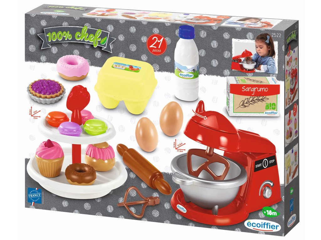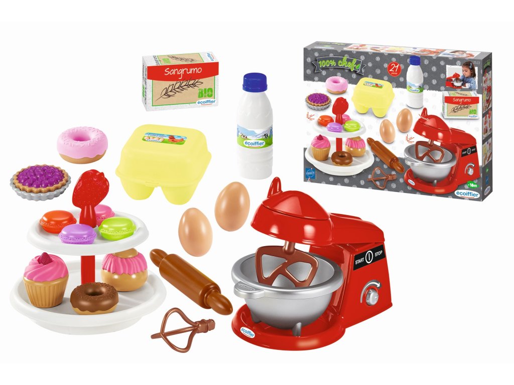 Sada obsahuje kuchyňského robota s mechanickou funkcí, se 2 míchacími nástavci a s mixovací miskou, stojan s moučníky, 2 vejce, váleček, různá prázdná balení potravin, makronky, koláčky, vdolky a koblihy. Celkem 21 doplňků. Rozměry produktu (DxŠxV): 70 x 25 x 20,5 cm.