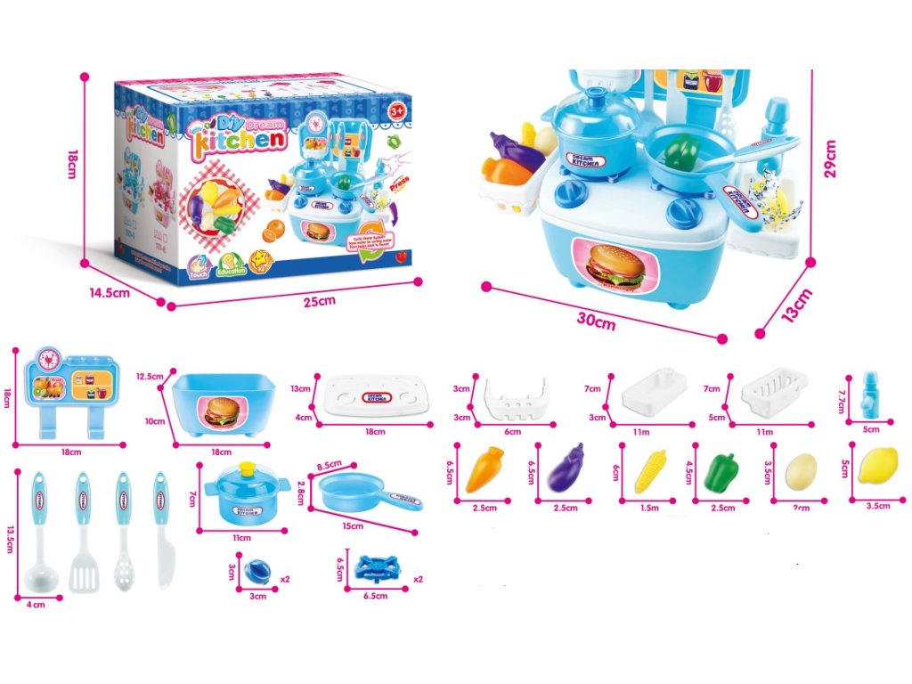 Mini kuchyňka, ve které se dá vařit spoustu dobrot. Rozměr kuchyňky 30x28x15 cm. Kuchyňka obsahuje malé nádobí, kuchyňské náčiní, makety potravin a další příslušenství.