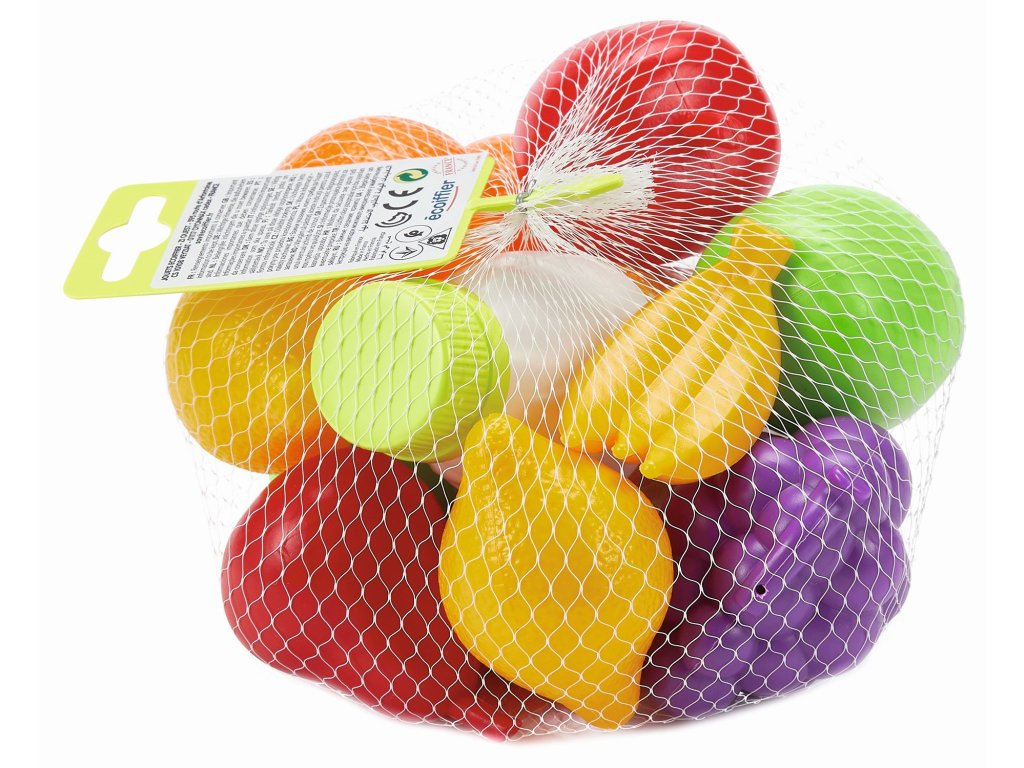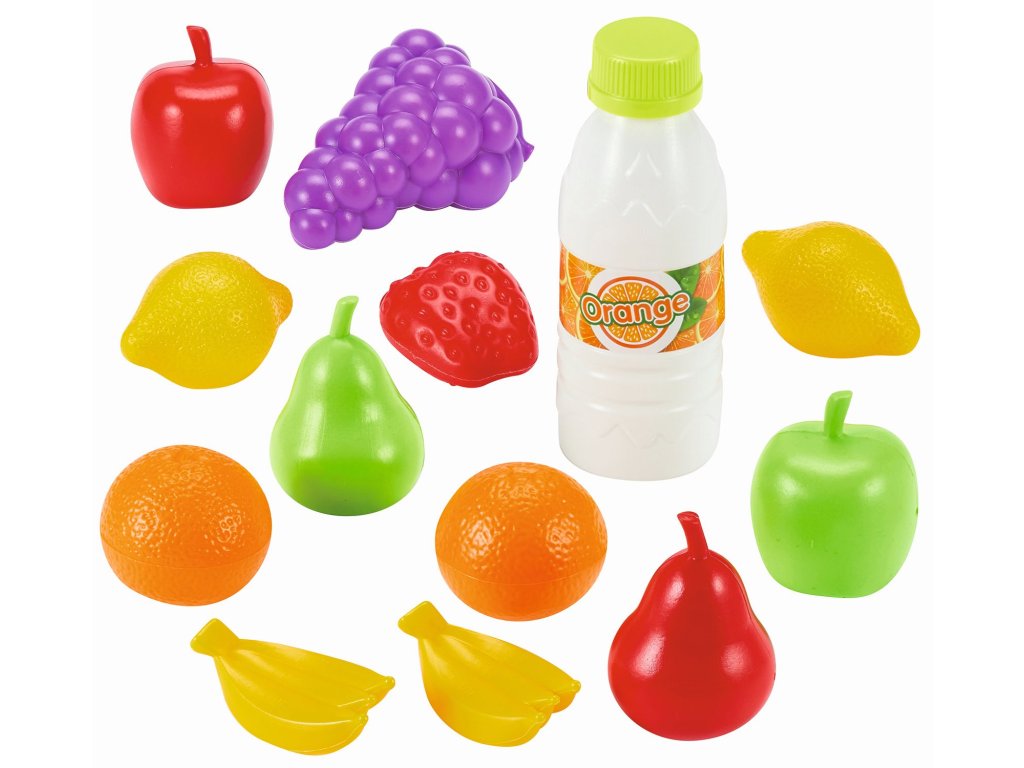 Makety potravin v síťce. Síťka obsahuje celkem 13 doplňků - 2 citrony, jahodu, 2 pomeranče, 2 jablka, 2 hrušky, 2 trsy banánů, hrozen vína a láhev pomerančového džusu. Ideální také jako vybavení obchodu nebo jako doplněk do dětské kuchyňky. Rozměry produktu (DxŠxV): 16 x 16 x 13 cm.