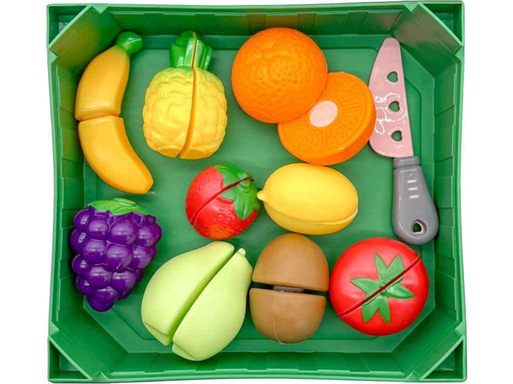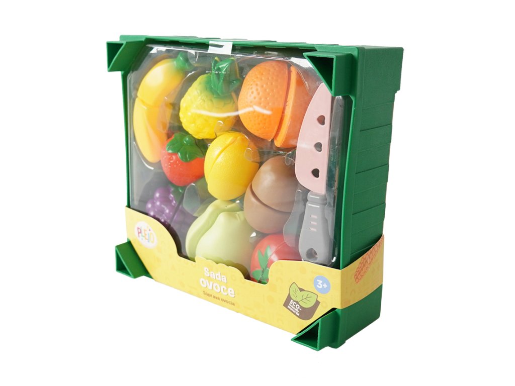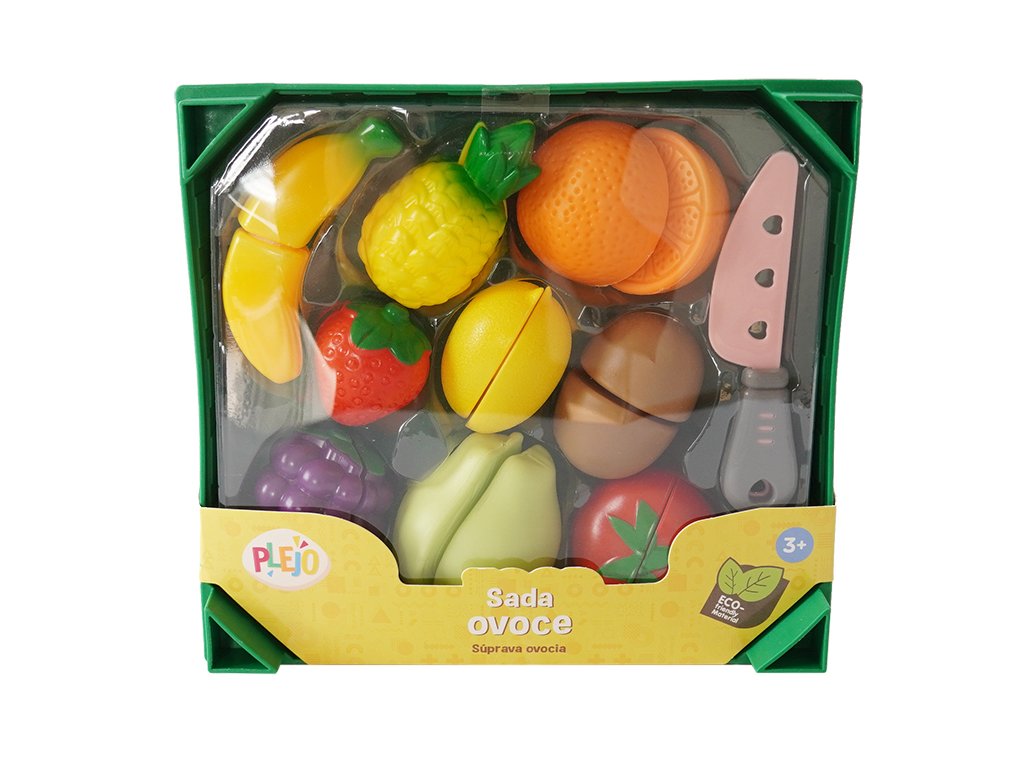 Sada ovoce v bedýce, která se dá skládat na sebe. Ovoce je na suchý zi a lze ho přiloženým nožem rozříznout. Sada obsahuje 19 ks.