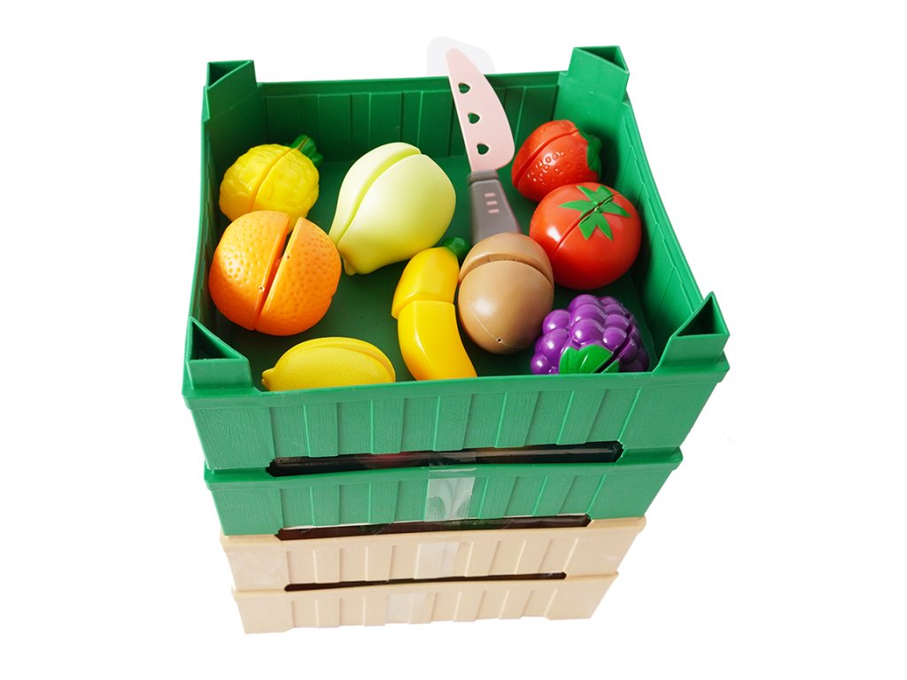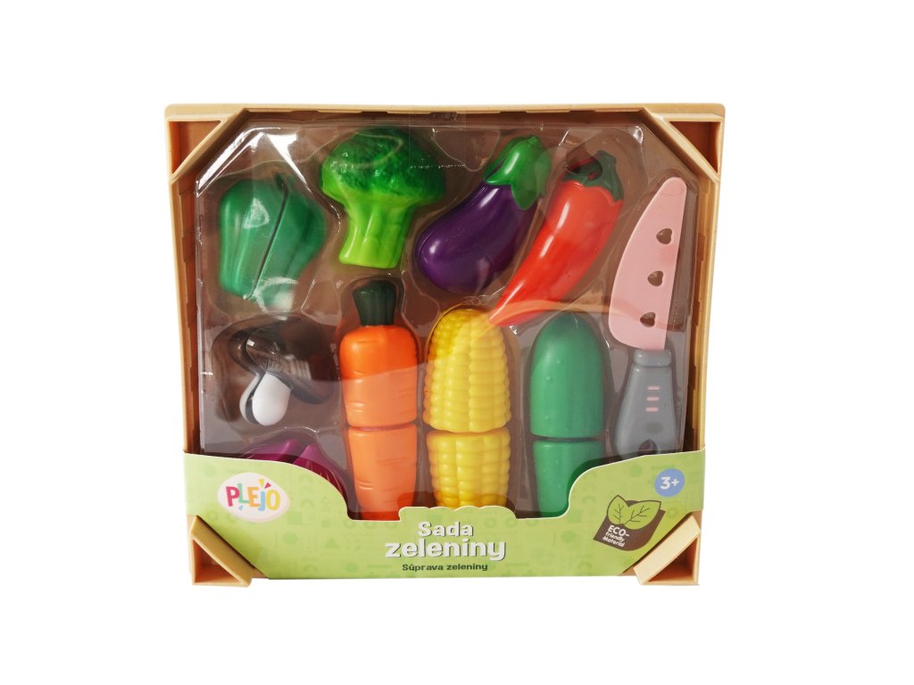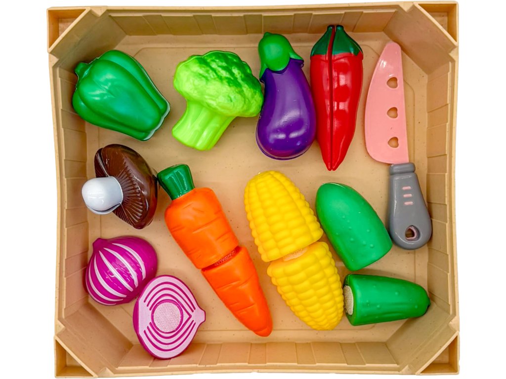 Sada zeleniny v bedýnce, která se dá skládat na sebe. Zelenina je na suchý zip a lze jí přiloženým nožíkem rozříznout. Balení obsahuje 19 ks.