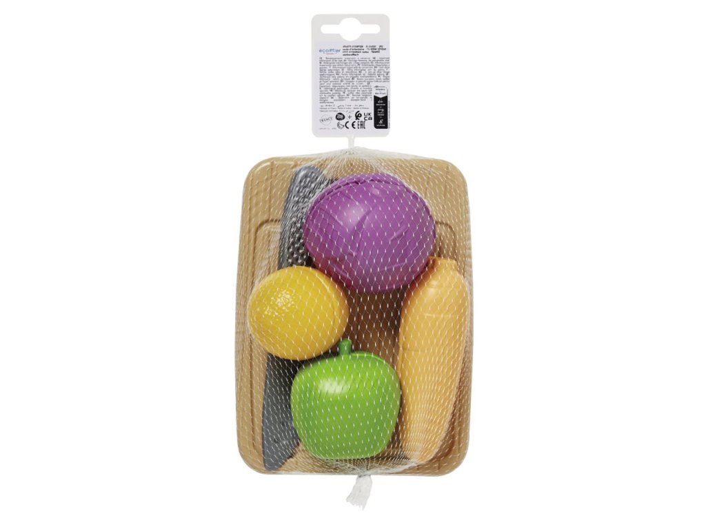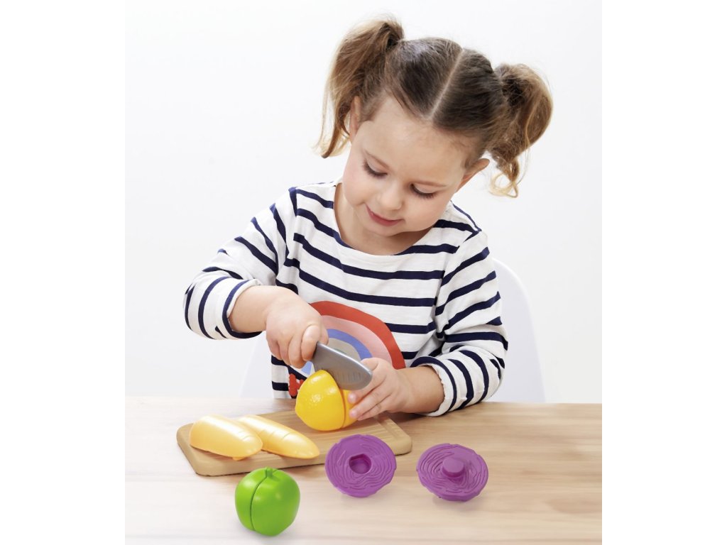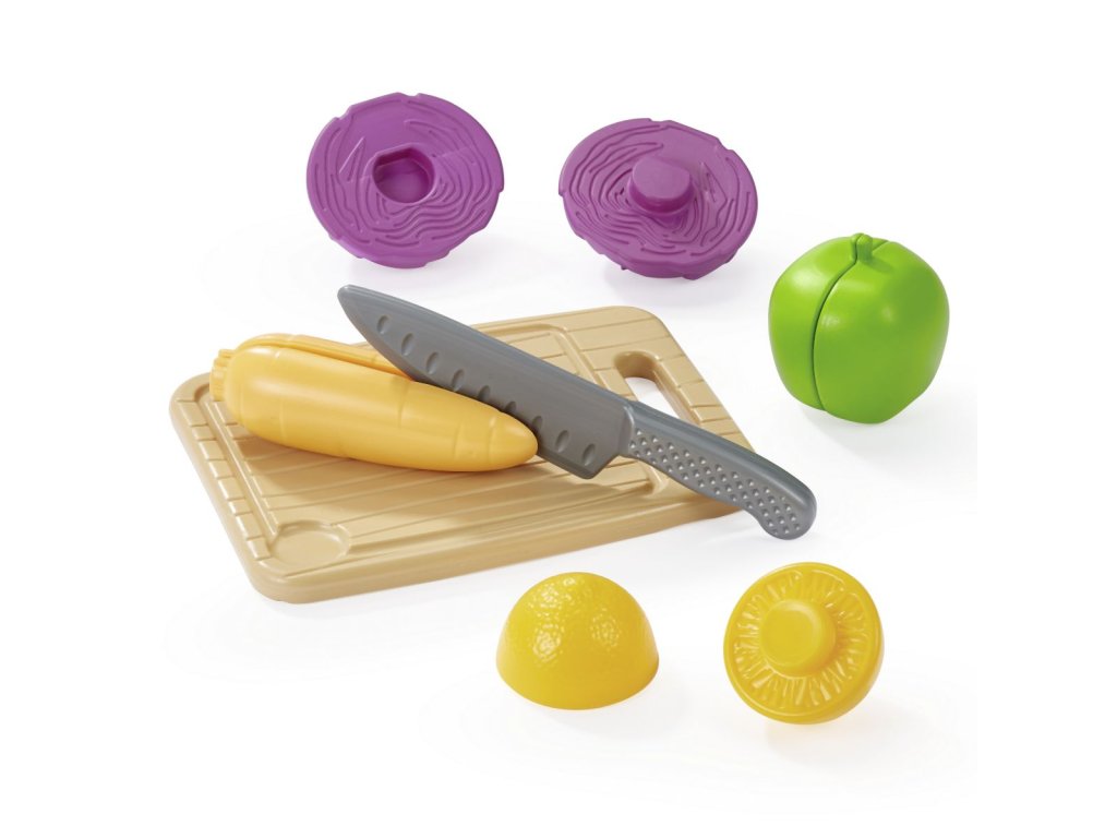 Kuchynské prkénko na krájení s nožíkem a zeleninou. Rozměry: 15 x 8,5 x 20 cm.