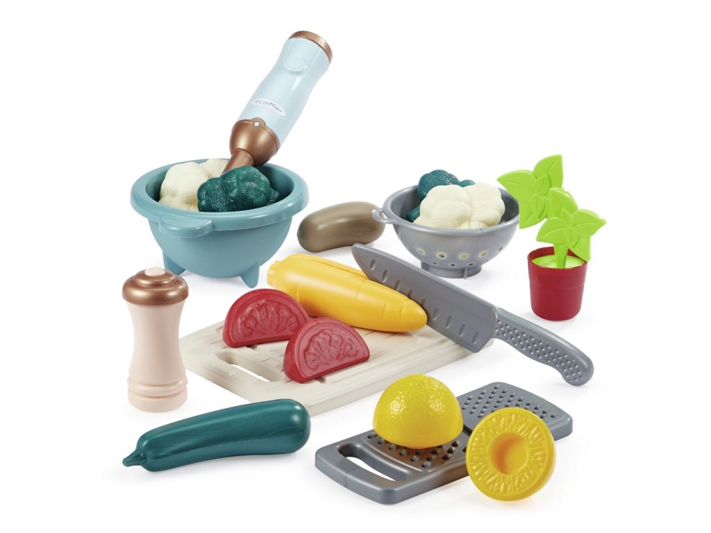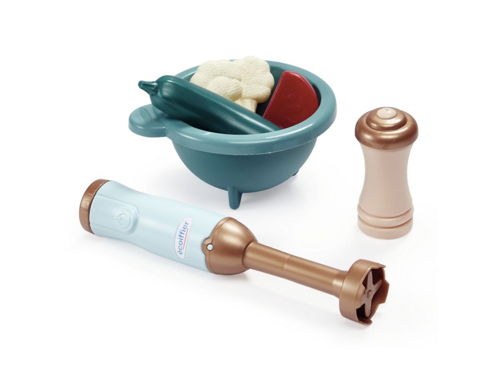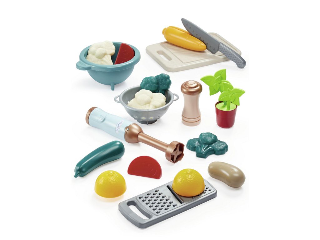 Sada na přípravu polévky obsahuje: tyčový mixér, misku, cedník, prkénko, nůž, struhadlo a makety zeleniny pro přípravu lahodné polévky. Rozměry mixéru: 4 x 4 x 23 cm.