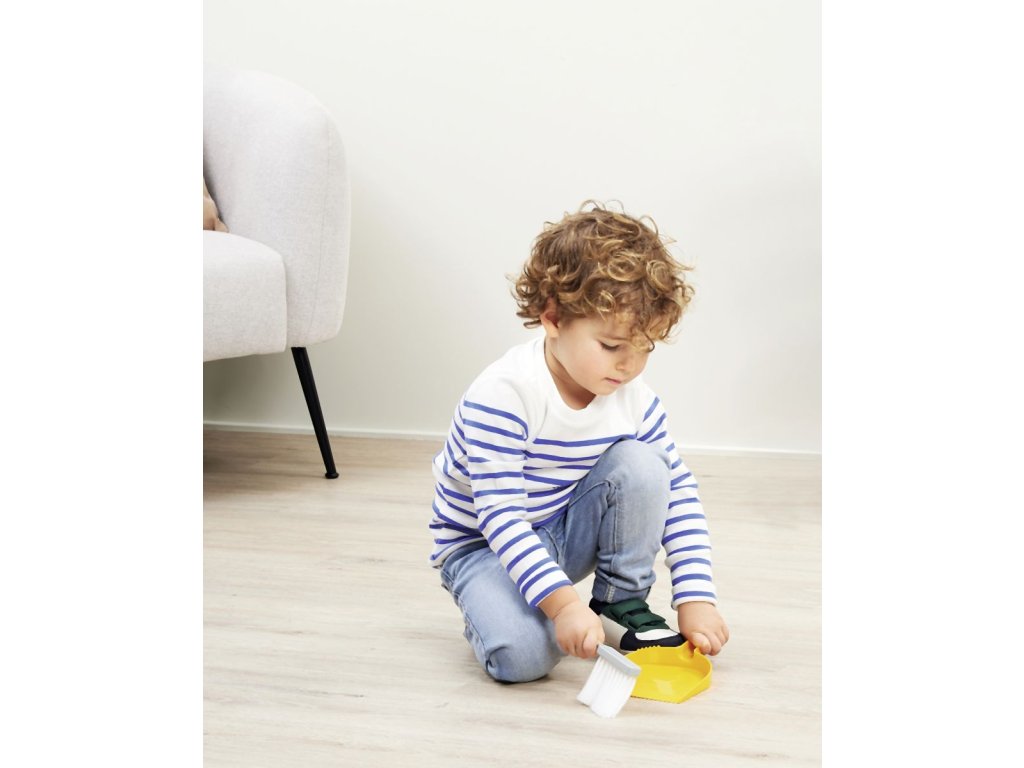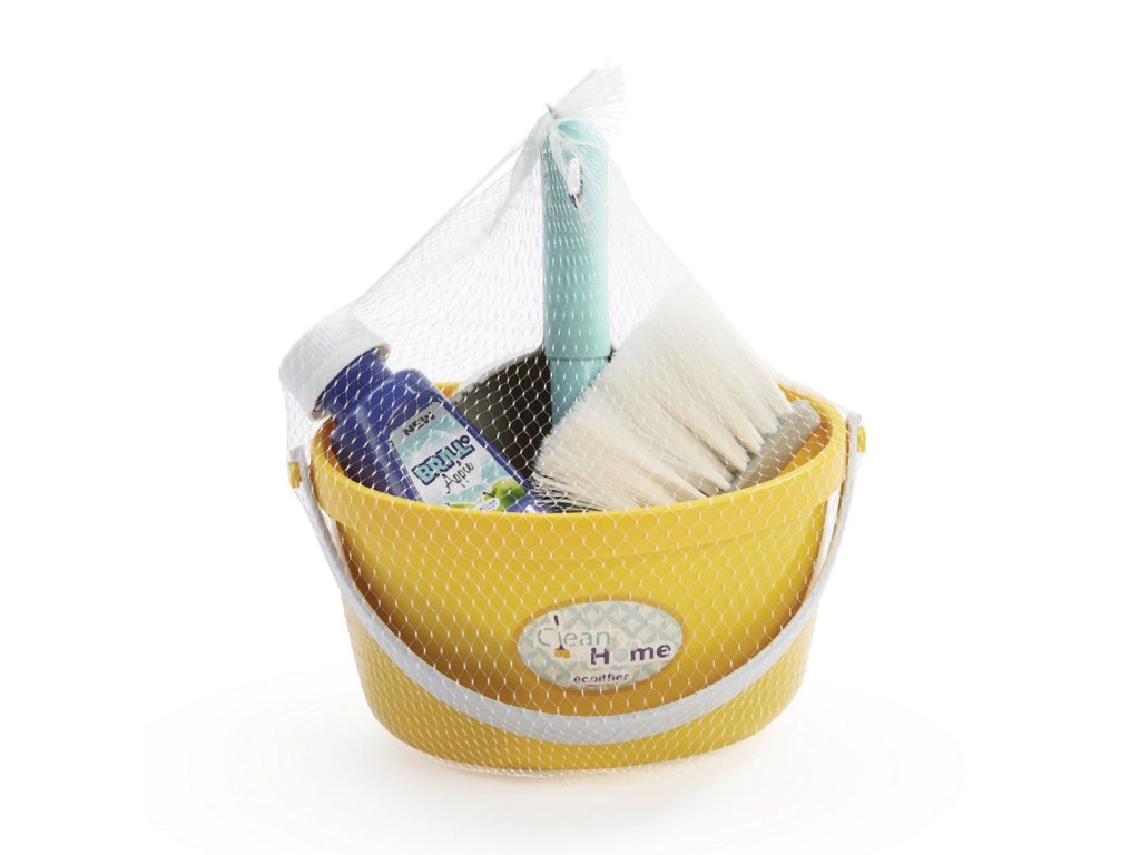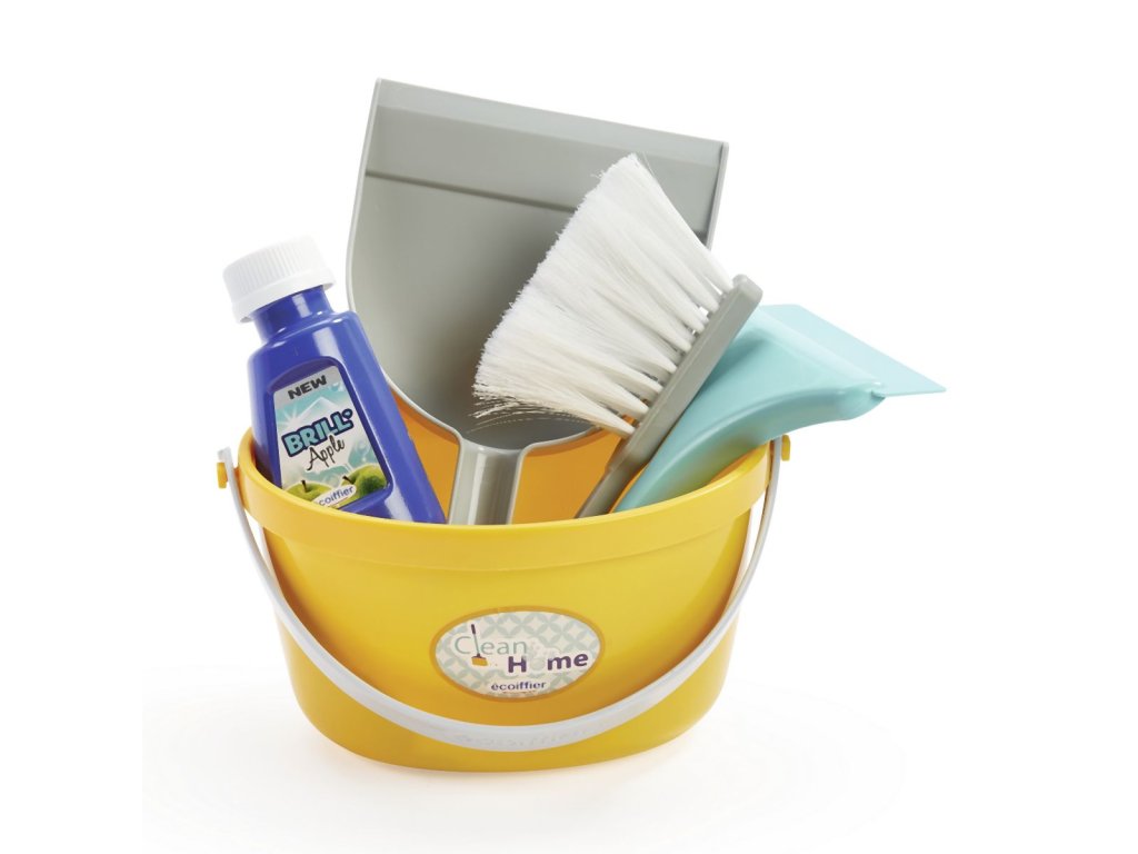 Sada na úklid obsahuje kyblík, smetáček a lopatku, stěrku na sklo a maketu čistícího prostředku.