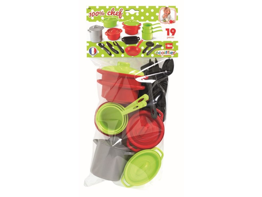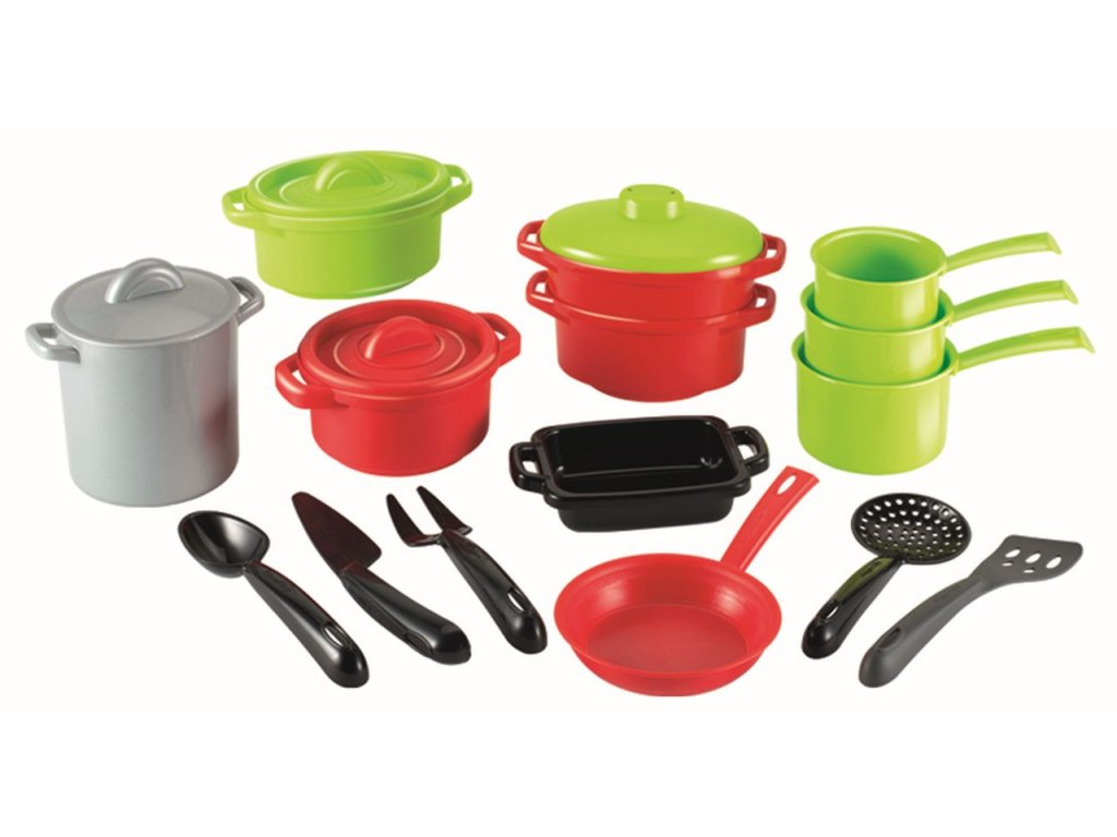 Sada nádobí na vaření obsahuje hrnce s pokličkami, rendlíky, zapékací nádobu, pánvičku a kuchyňské náčiní.