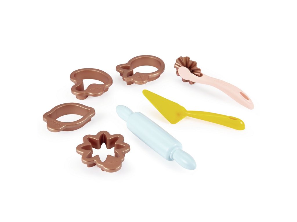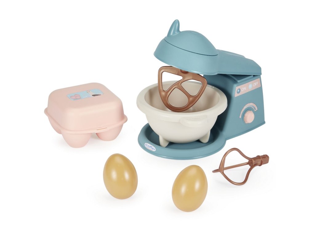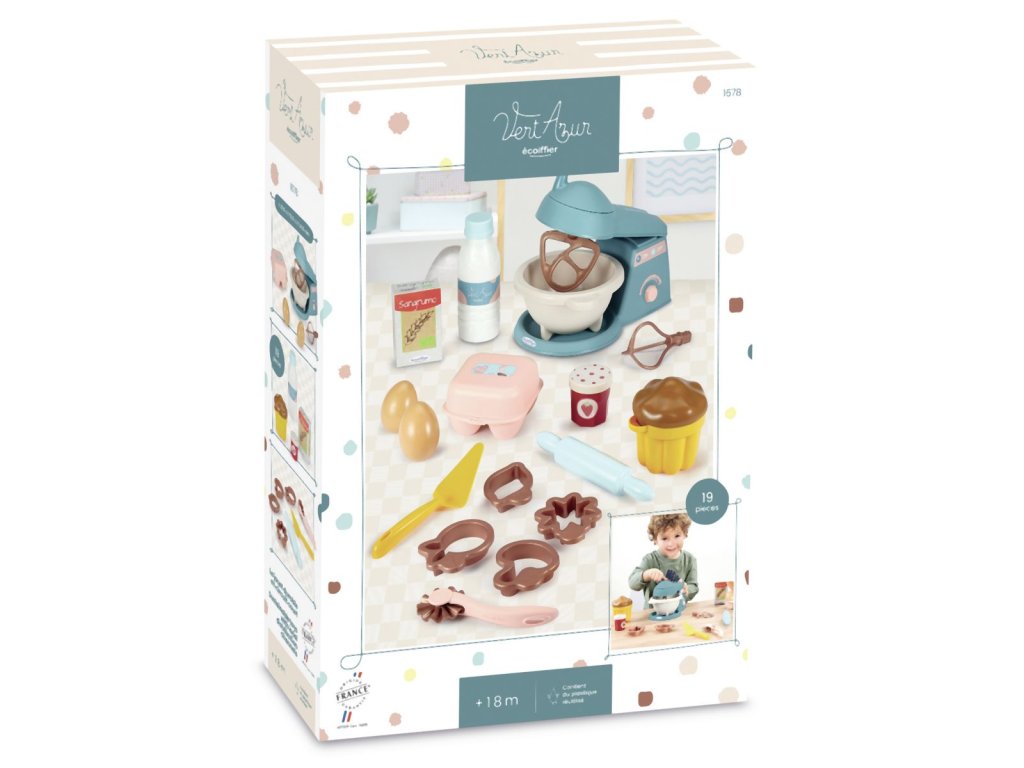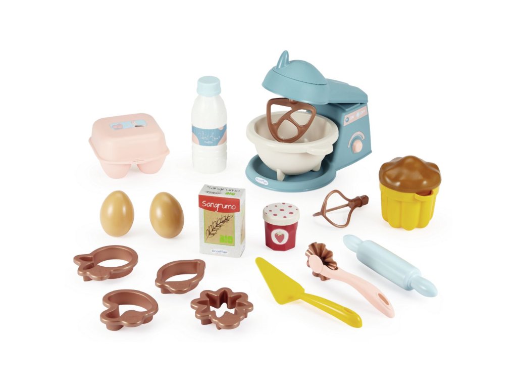 Sada obsahuje vše potřebné pro malé cukráře. Šlehač s 2 vyměnitelnými nástavci, forma i vykrajovátka na pečení, váleček, rádélka, vejce a další makety potravin. Celkem obsahuje 19 ks. Rozměry šlehače: 14,5 x 21,5 x 13,5 cm.