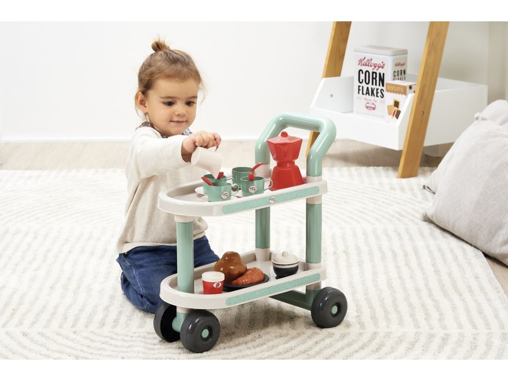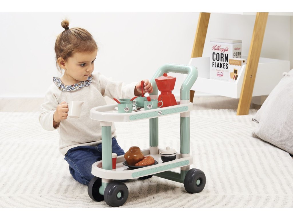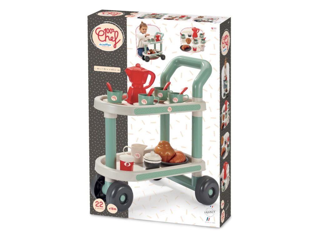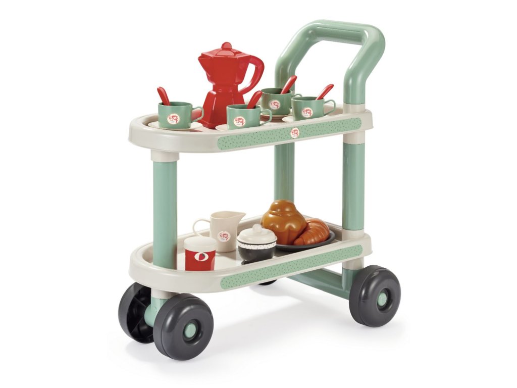 Snídaňový vozík na kolečkách s kávou i zákuskem, celkem 22 ks příslušenství. Rozměry vozíku (DxŠxV): 44 x 50 x 45,5 cm.