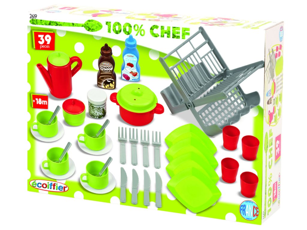 Sada jídelního servisu, potravin, hrnce vč. pokličky. Nechybí ani odkapávač nádobí.Sada obsahuje 39 ks.