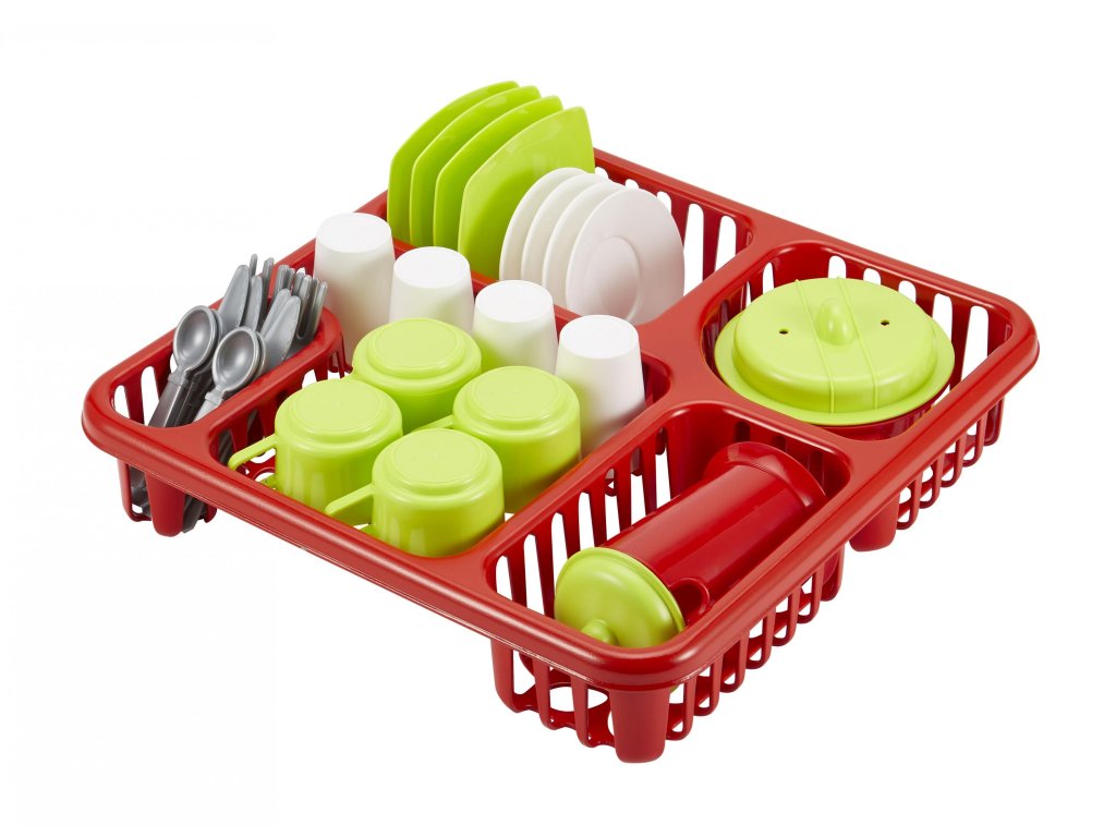 Velká sada nádobí s odkapávačem obsahuje hrníčky, příbory, talíře, hrnec s poklicí, konvičku s poklicí a šálky s podšálky. Rozměry odkapávače 29,5 x 10 x 29,2 cm. Věk: 18M+