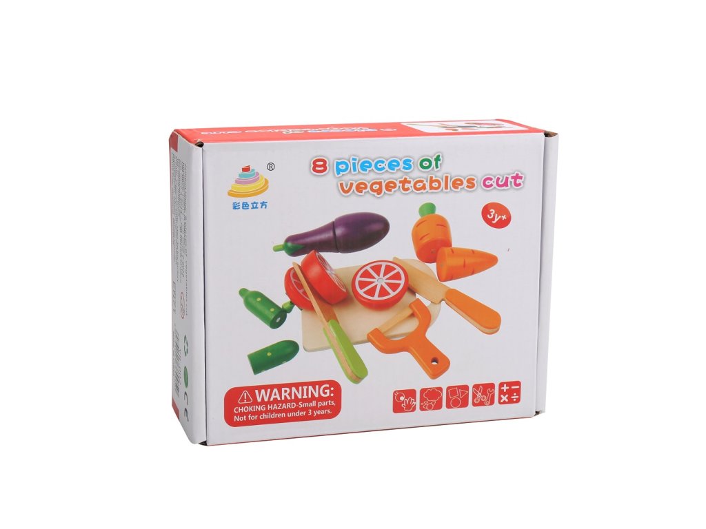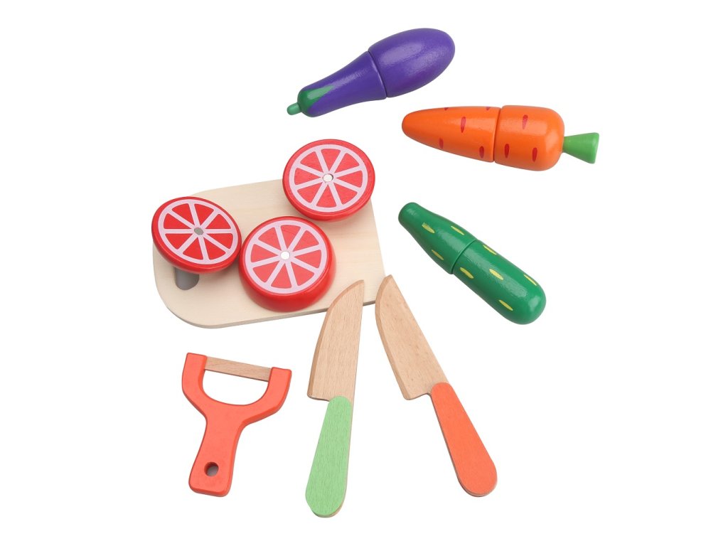 Krájecí dřeěné potraviny. Rozkroj mrkev nebo rajče. Hra pomáhá rozvoji dětské motoriky.
