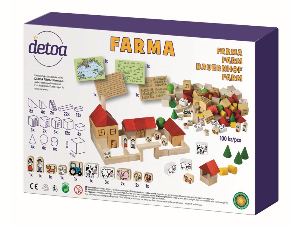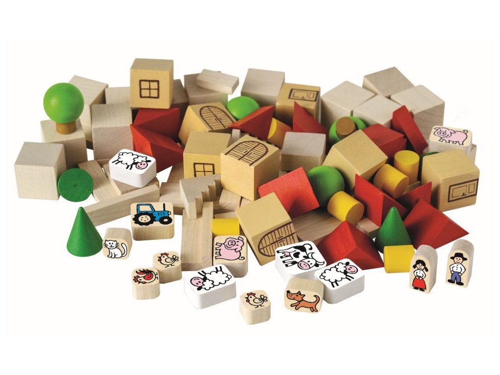 Stavebnice obsahuje 100 ks dřevěných dílků s potiskem v různých tvarech a velikostech.