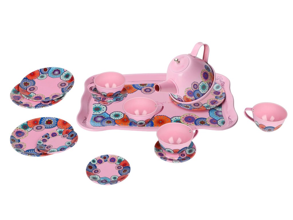 Nádobí sada 15ks. Obsahuje tác 24cm, konvici 11cm, 2x hrneček 6cm, 4x talířek 5,5cm, 4x talířek 7cm.