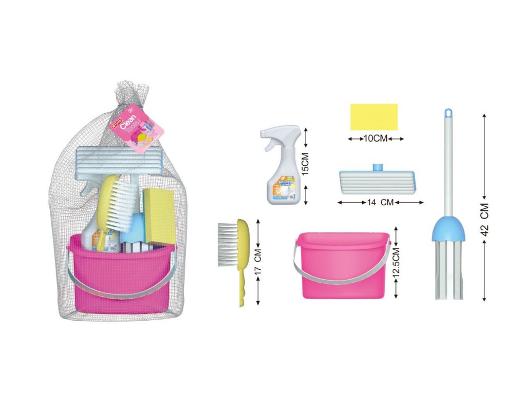 Úklidový set. Součástí kbelík, mop, smetáček, houba, čistící prostředek.