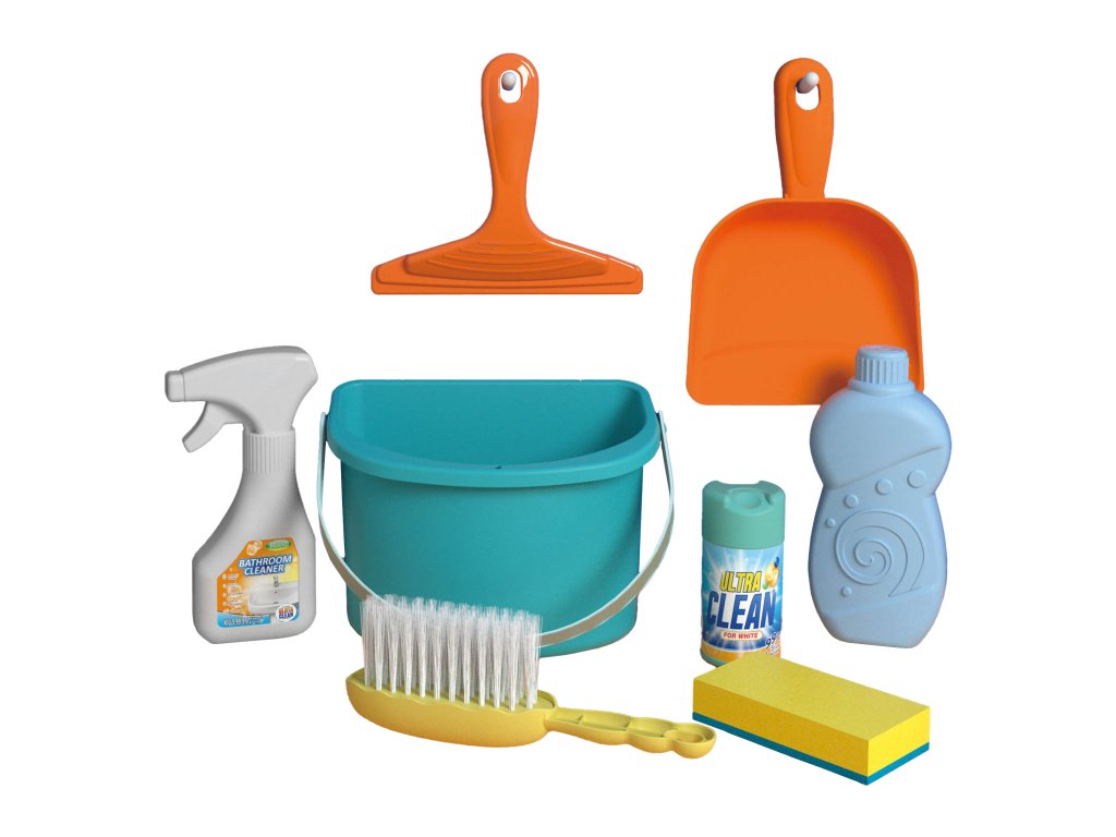 Úklidový set 8 ks. Obsah balení - kyblík, lopatka, stěrka, čisticí prostředky, smetáček.