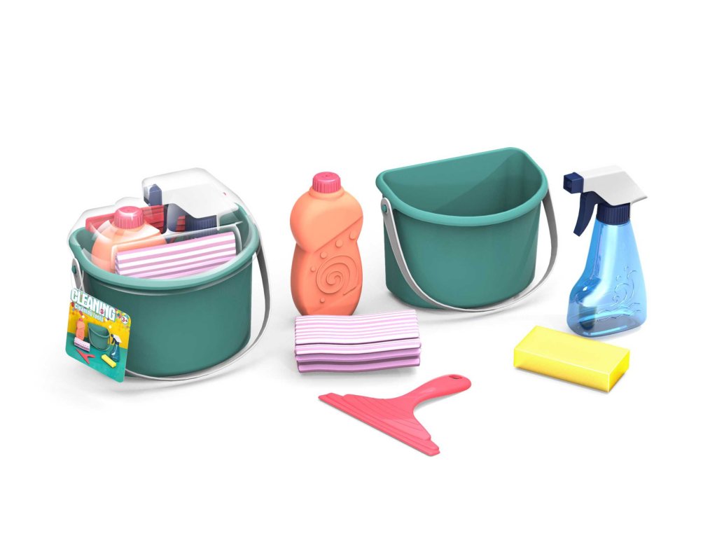Úklidový set. Součástí kbelík, stěrka, 2 houby, 2 čistící prostředky.
