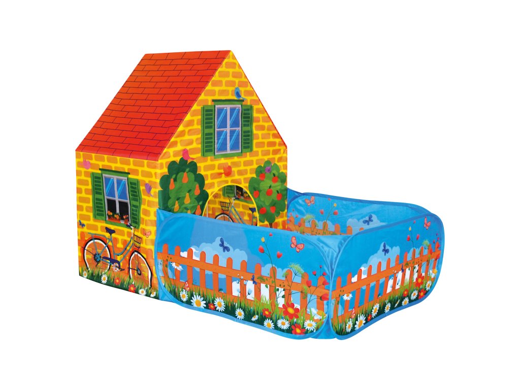 "Tento krásný domeček se zahrádkou potěší každou holčičku a chlapečka. Děti milují skrýše, schovávačky a domečky. Vytváří si tak kolem sebe vlastní imaginární svět, v němž prožívají svá dobrodružství a hry. Rozměr: 150x110x90cm.