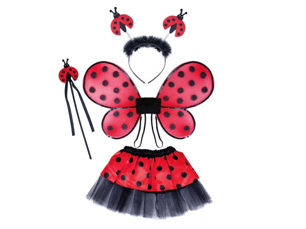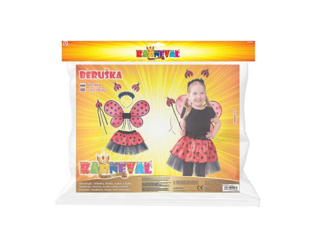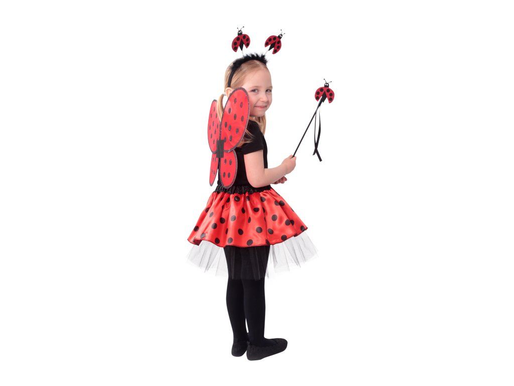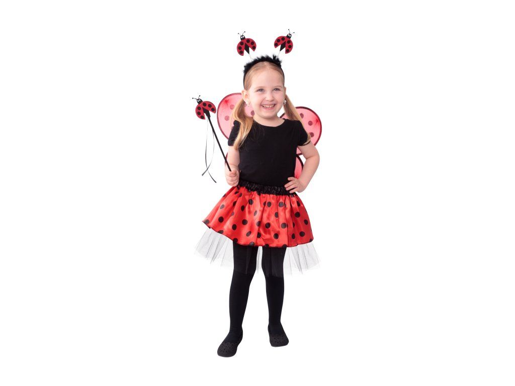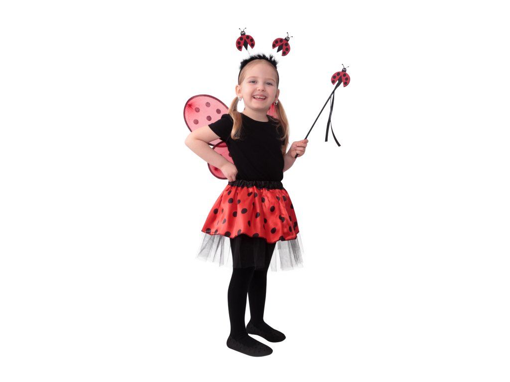 Roztomilý karnevalový kostým s motivem berušky je určen pro holčičky ve věkovém rozmezí 3-10 let. Tento kostýmek má červenou sukničku s puntíky, která je doplněna černou tylovou spodničkou. Dále obsahuje čelenku s peřím a beruškami, křídla na gumičku a hůlku. Celková délka sukýnky je cca 30 cm.