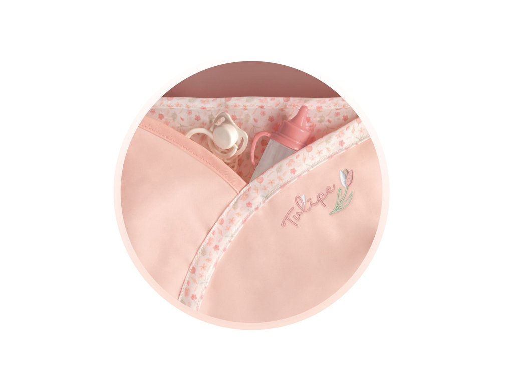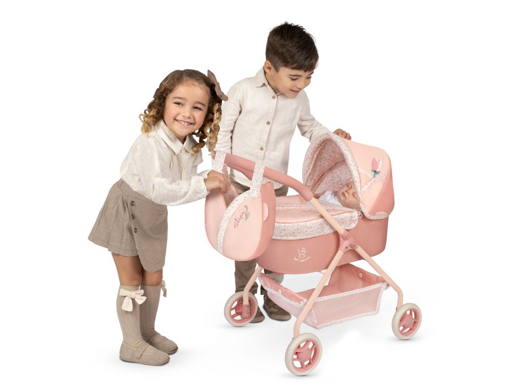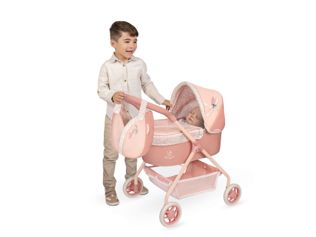 DeCuevas 86074 Můj první kočárek pro panenky s taškou Tulipe 2025 - 56 cm patří do stejnojmenné kolekce, která je novinkou roku 2025 a nabízí výběr výrobků od jídelních sad přes postýlky a kočárky až po dřevěný nábytek pro panenky. Tulipe je, jak již sám název napovídá, kolekce plná tulipánů v překrásně sladěných teplých pastelových lososových barvách. Světlejší a tmavší odstíny barev jsou vkusně doplněné drobným květinovým vzorem ve stejných tónech na bílosmetanovém podkladu. Tento motiv ještě navíc u kočárků umocňují svým tematickým tvarem i překrásné, jako tulipán vypadající tašky. Květ tulipánu zdobí i dřevěné výrobky této kolekce.Doplňky a vybavení:• Ozdobná odnímatelná taška na kočárek ve tvaru tulipánu • Ozdobný kryt na korbičku s očky pro uchycení a s kapsičkou• Kapsa na boudičce kočárku s textilním tulipánem a rolničkou• Matrace• Úložný prostor v dolní části kočárku• Rozměry kočárku: 50 × 35 × 60 cm (celková výška kočárku)• Výška k rukojeti: 56 cm• Vnitřní rozměr korbičky: 41 x 24 cm (d x š) • Panenka s doplňky není součástí baleníDoplňující informace:• Nádherný španělský design• Precizní zpracování• Velmi snadná manipulace během samotné hry• Materiál: kov, plast, textil• Baleno v ozdobné krabici v barvách kolekce• Rozměry balení: 44,8 x 11 x 32 cm (d x š x v) • Váha balení: 2,38 kg• U vybraných modelů je na obalech QR kód s videonávodem na sestavení • Doporučený věk od 3 letDeCuevas 86074 Můj první kočárek pro panenky s taškou Tulipe 2025 - 56 cm ze stejnojmenné kol