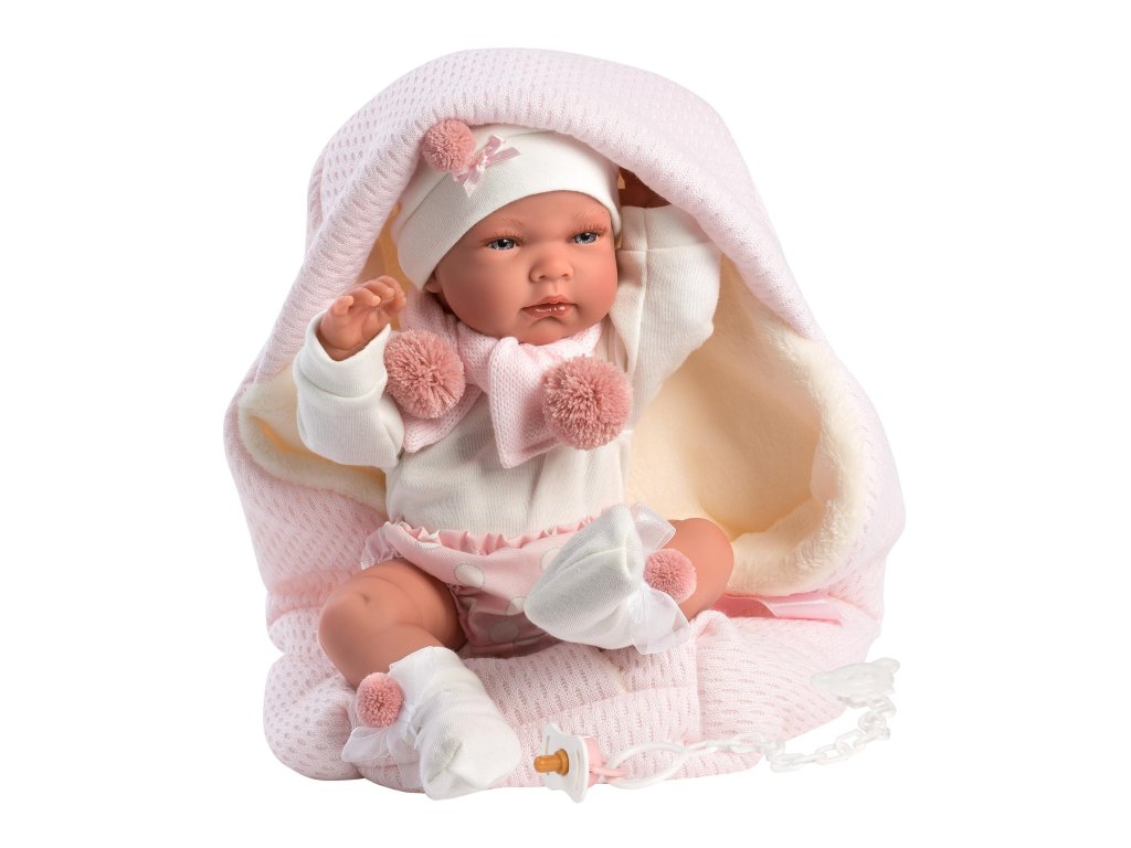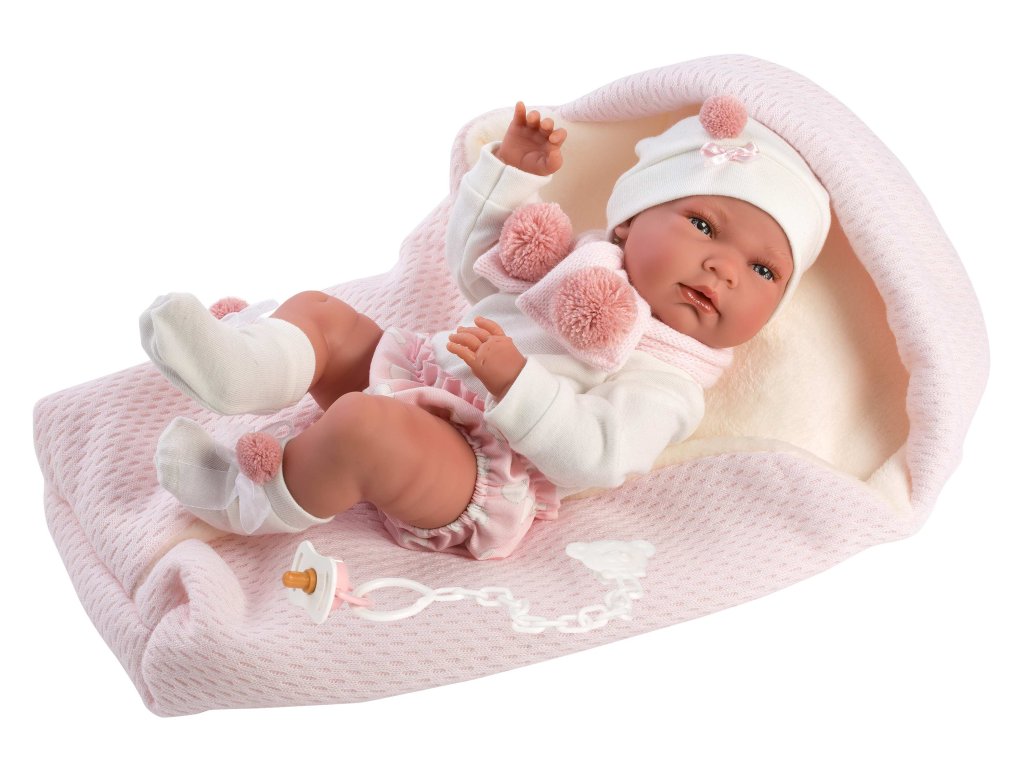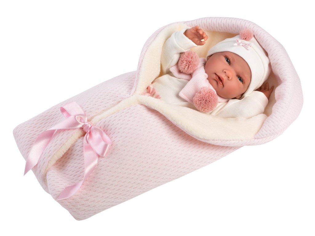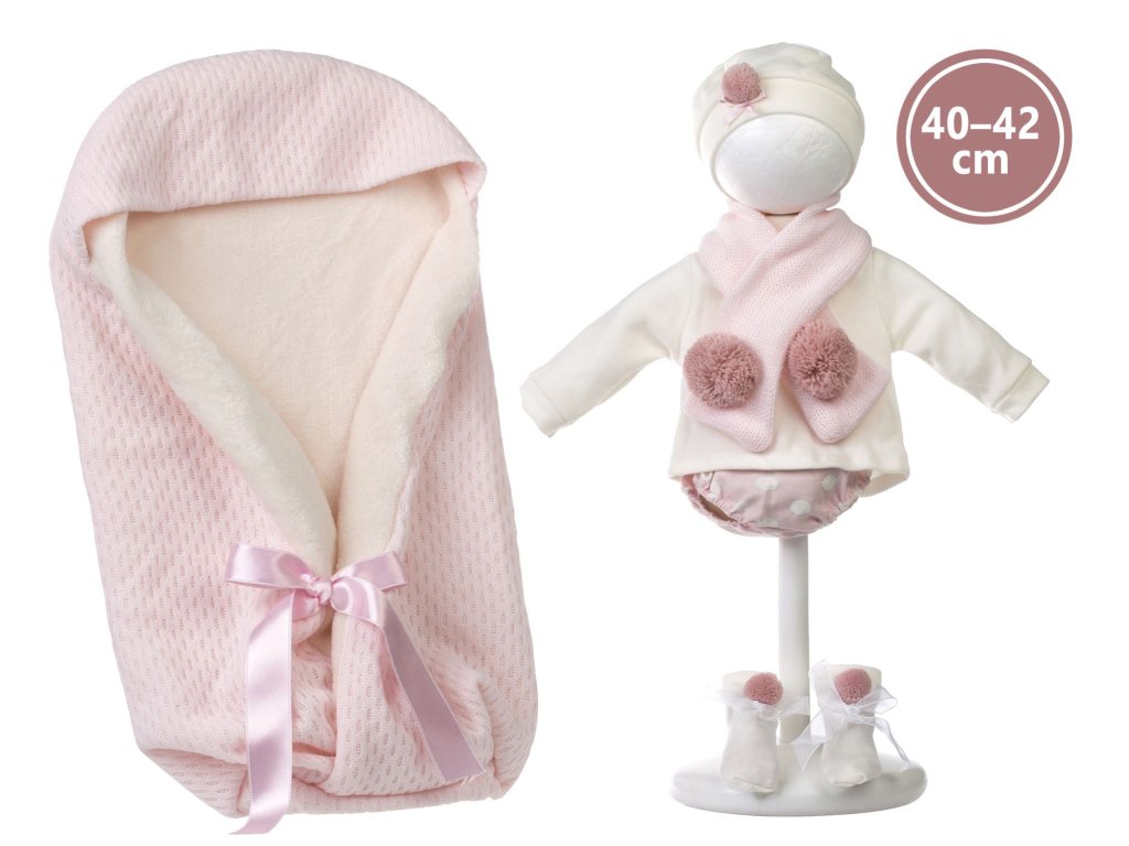 5dílný obleček s rychlozavinovací dekou s kapucí pro panenku miminko NEW BORN Llorens velikosti 40-42 cm. Vyrobeno ručně ve Španělsku, baleno v igelitovém obalu s plastovým ramínkem. Doporučený věk od 3 let.